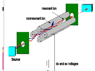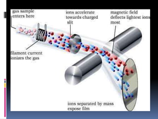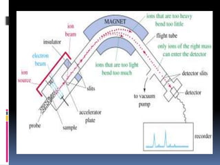 Mass spectrometry is an analytical technique that ionizes chemical species and sorts the ions based on their mass-to-charge ratio. It can provide qualitative and quantitative data about samples on an atomic or molecular level. The document discusses the principle, instrumentation, and applications of mass spectrometry. Key components of mass spectrometers include an ion source, accelerating system, magnetic field, ion separator, ion collector, and vacuum system. Mass spectrometry has applications in structure elucidation, detection of impurities, quantitative analysis, and various clinical and forensic analyses.
