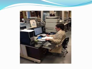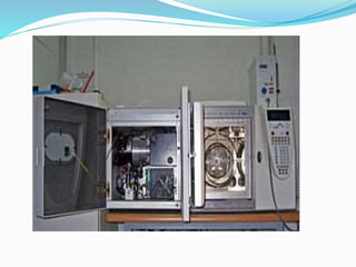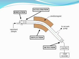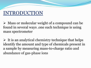 Mass spectrometry is an analytical technique that identifies chemicals in a sample by measuring the mass-to-charge ratio of gas-phase ions. It works by generating molecular ions from the sample, which then fragment and are separated by their mass-to-charge ratio in the mass spectrometer. This produces a mass spectrum that displays ion abundance versus mass-to-charge ratio. Mass spectrometry is commonly combined with gas chromatography or liquid chromatography to first separate compounds before analysis. It has applications in structure elucidation, detection of impurities, and is a sensitive and specific technique used in many analytical laboratories.