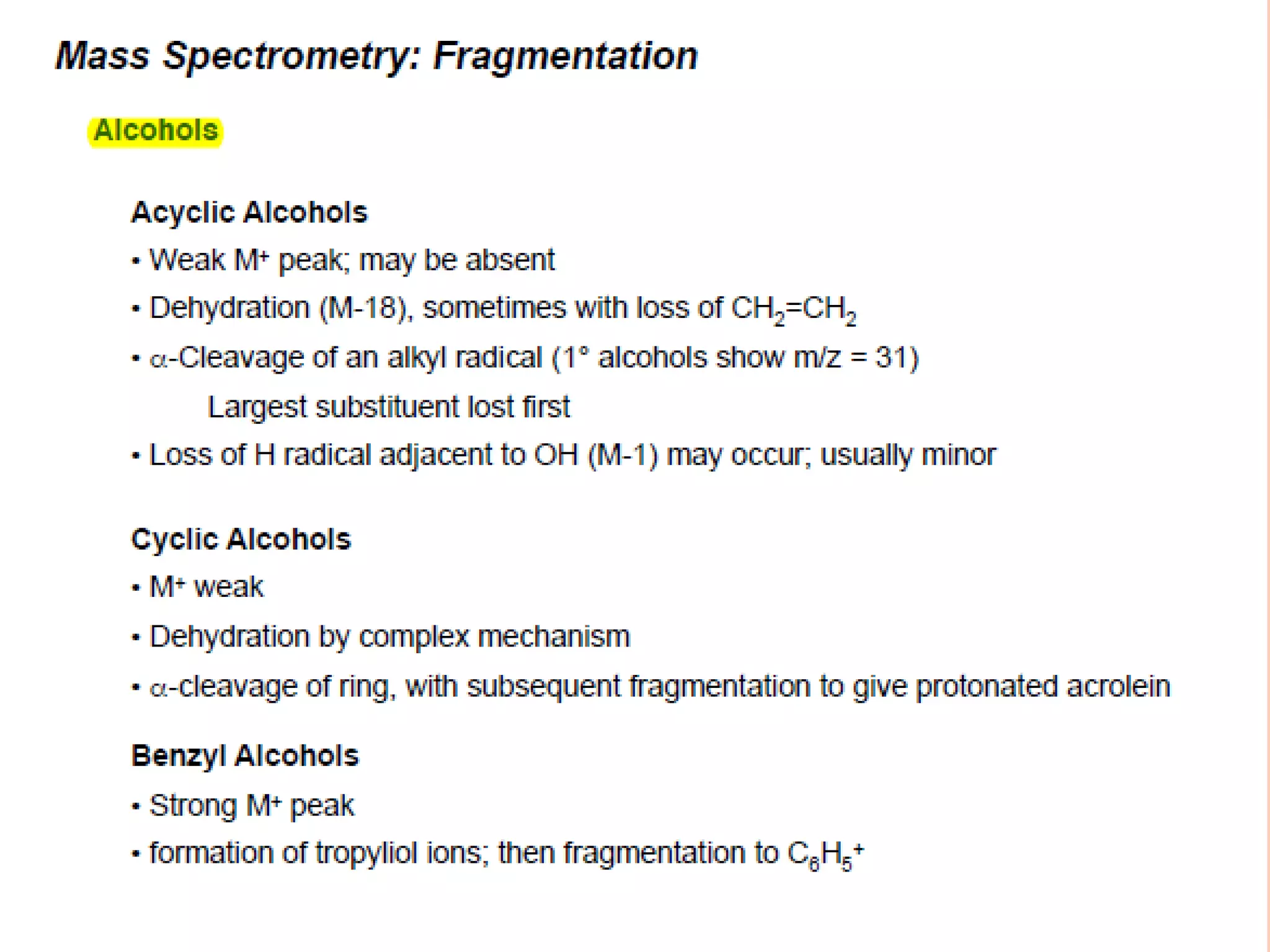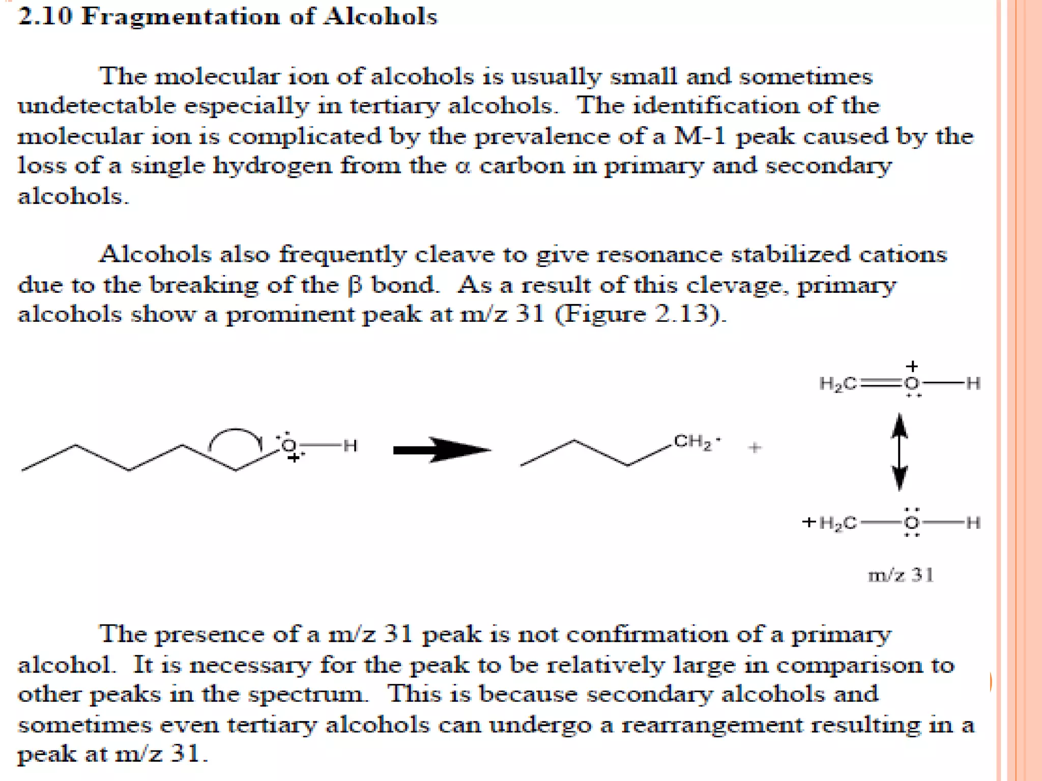 Jerry K Mathew received his MSc in Chemistry from St. Mary's College in Manarcaud. Alcohols often undergo rearrangement reactions that result in a peak from the loss of water at M-18 on a mass spectrometer. This peak is most visible for primary alcohols but can also appear for secondary and tertiary alcohols. Primary alcohols may also lose both water and an alkene. The document includes a digitized spectrum of 2-hexanol.