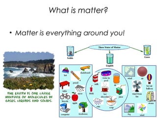 This document defines matter and discusses how to measure its mass and volume. It explains that matter is anything that has mass and takes up space, and provides examples like pencils, books, and cars. Mass is the amount of matter in an object and is measured using a balance scale. Volume is the amount of space an object occupies and can be found using formulas for different shapes or water displacement. Graphs are used to show relationships between variables and different types like line graphs track changes over time while bar graphs compare amounts.