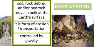 Mass wasting refers to the movement of soil, rock, and debris downslope under the force of gravity. It is a type of erosion and can occur rapidly, such as in landslides, or slowly through creeping. Mass wasting is influenced by many factors like slope angle, rock type, climate, vegetation, and pre-existing weaknesses in the slope material. It poses hazards through loss of life and property damage, often greater than earthquakes or volcanoes. Proper slope management through stabilization techniques and monitoring can help prevent mass wasting events.