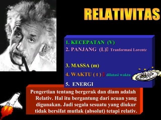 1. Teori relativitas menyatakan bahwa massa suatu benda yang bergerak lebih besar dari massanya ketika diam.
