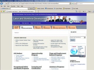The document outlines the services provided by Massachusetts career centers, which include job matching, resource access, and training opportunities for both job seekers and employers. It highlights special services for veterans, youth, and disadvantaged adults, as well as support for businesses such as labor market information and recruitment coordination. Resources and online tools are also provided for job seekers and employers to access additional information and assistance.