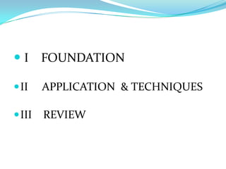The document discusses the application of massage therapy as a medical modality, focusing on its foundations in anatomy, injury treatment, and pain relief techniques. It covers various conditions including cervical issues, shoulder impingement, and low back pain, along with the importance of body mechanics and connective tissue. The author, Andrew Wolfe, emphasizes compassionate care and the role of massage therapy in managing pain and facilitating healing.