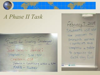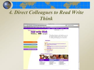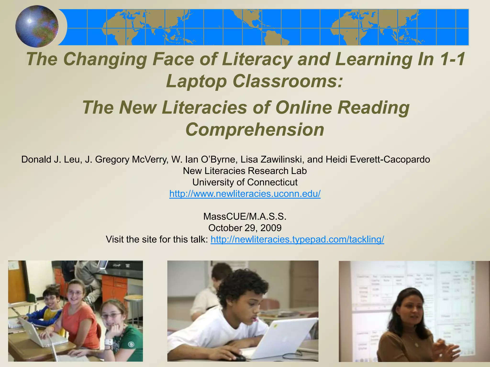 The document discusses the new literacies required for online reading comprehension in the modern digital age. It presents a model for teaching these new literacies called Internet Reciprocal Teaching (IRT), which involves three phases: teacher-led instruction of basic skills, collaborative modeling of strategies, and inquiry-based projects. IRT emphasizes problem-based learning and using the internet to solve information problems. The document argues that school leadership must support a changing literacy curriculum focused on online reading comprehension and integrating technology into subject areas in order to prepare students for the 21st century.