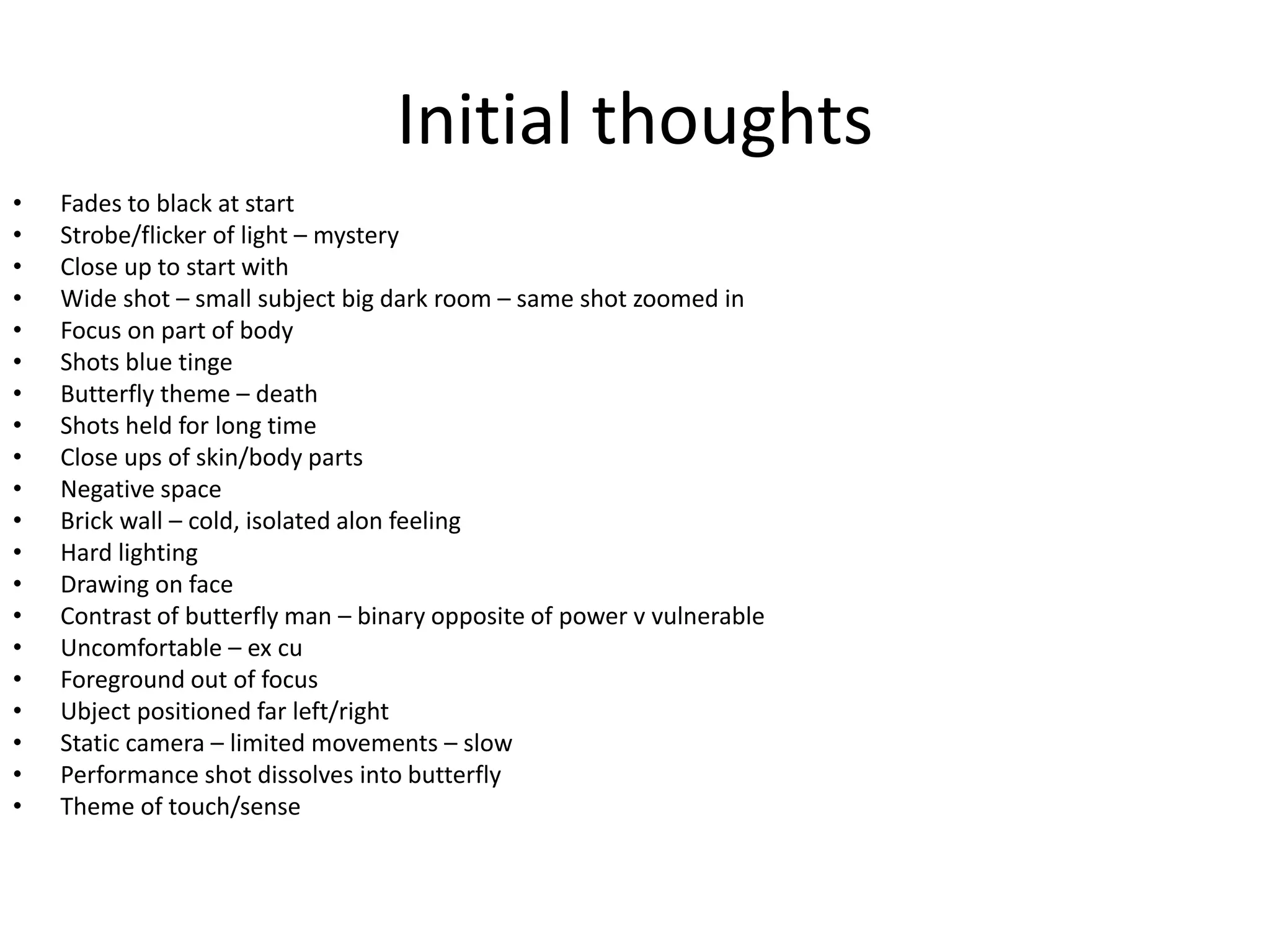The music video consists mainly of extreme close-ups and long shots of the subject in a large, dark, brick room meant to evoke isolation. The lighting flickers, creating a strobe effect and sense of mystery. Shots are held for a long time with little camera movement. Throughout the video, the performer's clothes are ripped away and a butterfly imprint appears on his skin, transforming him into the vulnerable subject. The video ends by dissolving the performer into a dead butterfly, linking to themes of binary opposition between the powerful performer and vulnerable butterfly.