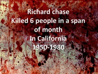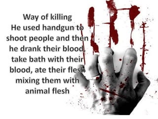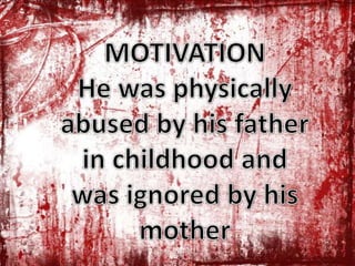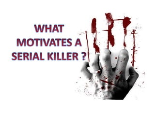 This document discusses the profile and motivations of serial killers like Ed Gein, known as the Mad Butcher and Leather Face. Gein killed several women in Plainfield, Wisconsin between 1954-1957. He mutilated their bodies and kept their organs and skin. When authorities searched his house, they found objects made from human skin and bones. Gein suffered from mental illness and was frustrated by his mother's death, which led him to kill women and take their organs. He was eventually sentenced to death but overdosed before his execution. Motivations for serial killing discussed include fear of rejection, desire for power and perfection.