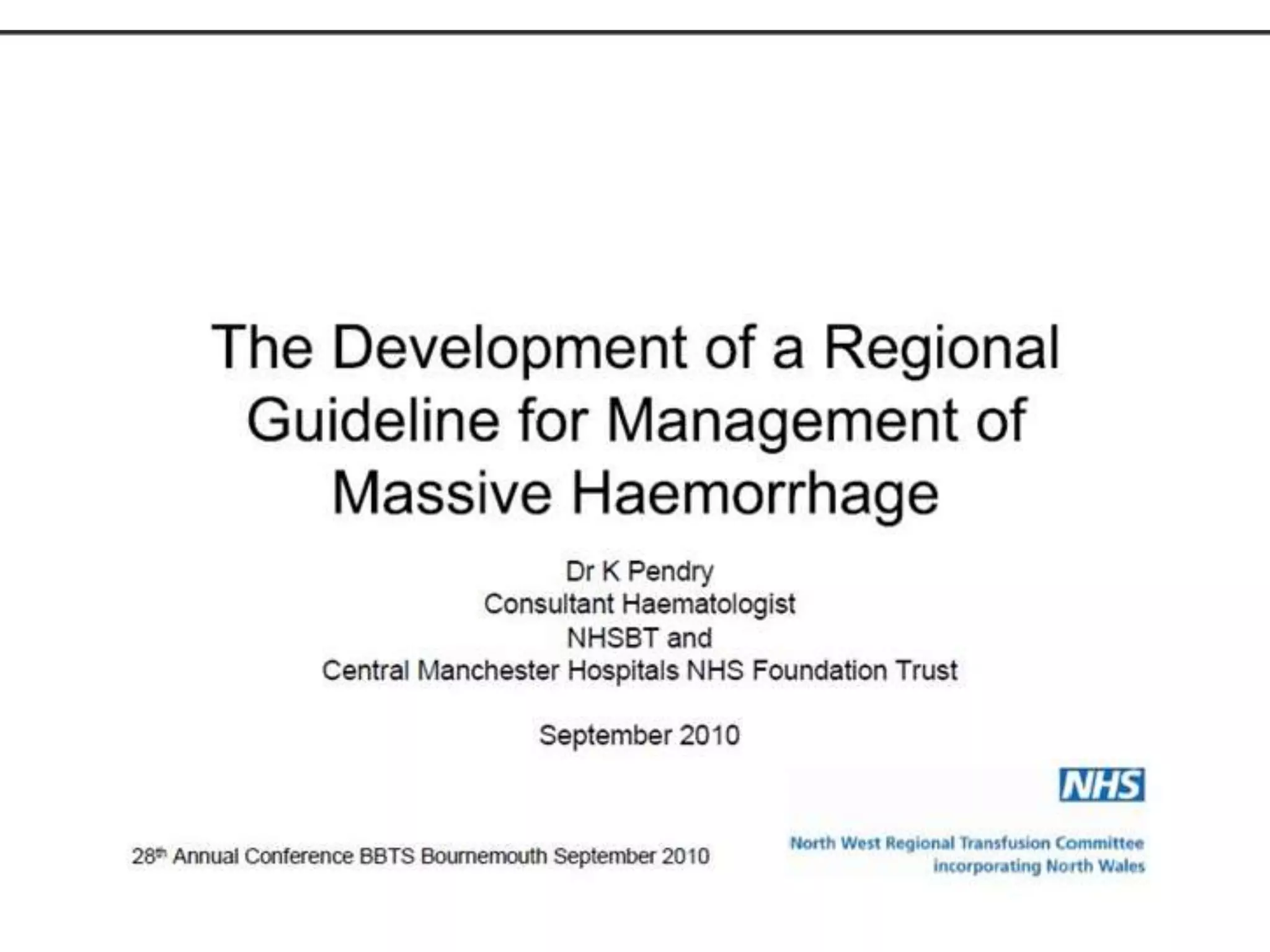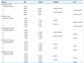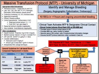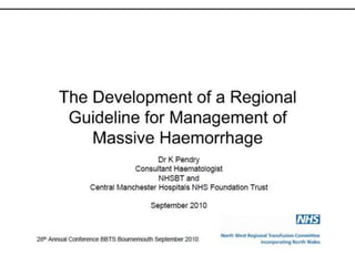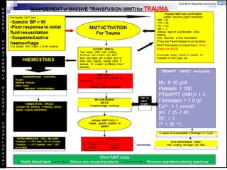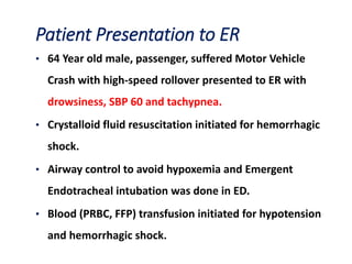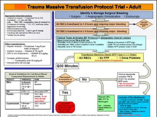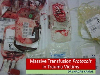 This document discusses massive transfusion protocols (MTP) for trauma victims who experience severe bleeding. It describes the presentation of a 64-year-old male trauma patient who suffered injuries from a motor vehicle crash including internal bleeding and fractures. He received over 18 units of blood products during treatment including surgery. The document then provides details on MTPs including their components, guidelines for blood product ratios, and studies investigating optimal resuscitation approaches to reduce mortality from hemorrhage.