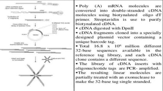 Lynx Therapeutics' Massively Parallel Signature Sequencing (MPSS) is an early high-throughput DNA sequencing technique. It works by attaching cDNA from an mRNA sample to beads, determining short sequence signatures from many beads in parallel, and using the signatures to count the number of individual mRNA molecules from each gene. This digital gene expression data allows MPSS to accurately quantify genes expressed at low levels by analyzing transcripts from virtually all genes simultaneously. The technique involves converting mRNA to cDNA, attaching oligonucleotide tags, PCR amplification on beads, and using fluorescent probes to determine short sequences in increments of four nucleotides from millions of beads in parallel.