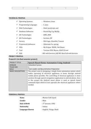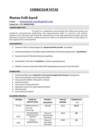 Mastan Valli Sayed is seeking a competitive career that utilizes his analytical, interpersonal, leadership and organizational skills. He has experience with summer training at Airport Authority of India and has participated in various academic competitions and workshops. He has strong technical skills in programming languages like Java and C, web technologies, databases, frameworks, and IDEs. He holds a B.Tech degree with 60% aggregate and has experience leading a speech-based home automation project using Android as part of his final semester project.