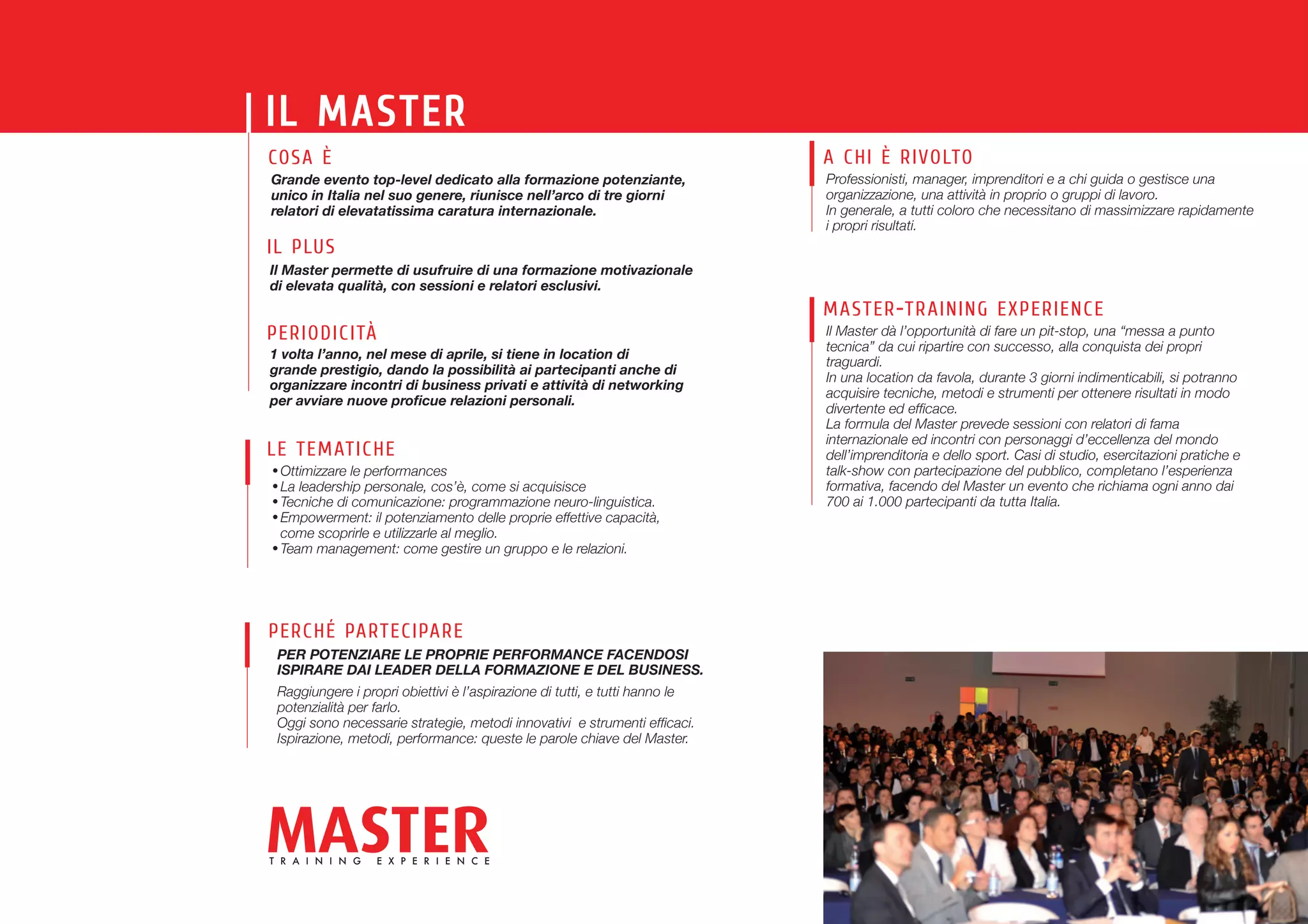 Il master è un evento di formazione esclusivo in Italia, destinato a professionisti, manager e imprenditori, che si tiene annualmente ad aprile. Durante tre giorni, i partecipanti possono apprendere da relatori internazionali e partecipare a sessioni pratiche, networking e talk-show. L'obiettivo è massimizzare le performance individuali attraverso strategie innovative e tecniche di empowerment.