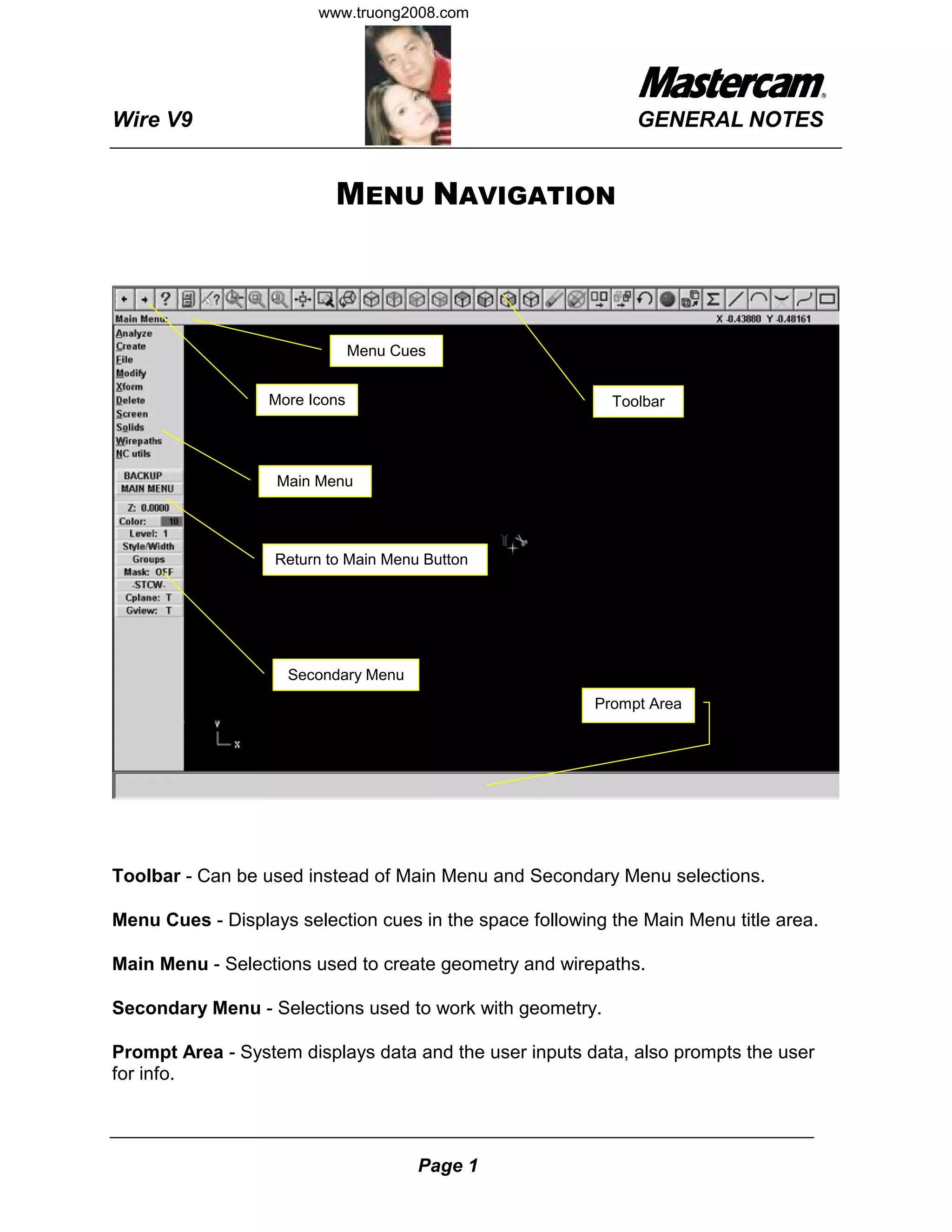 The tutorial covers the main menu, secondary menu, and other interface elements of Wire V9 such as toolbars, menus, and prompt areas for inputting data. It also describes functions for creating and modifying geometry, transforming objects, and programming wirepaths. Default key bindings are listed to navigate the interface and access common commands.