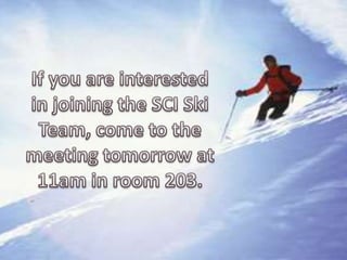 Several announcements were made including extracurricular activities like a Grease read through, pickup basketball, volleyball and hockey meetings. Tickets were available for a Barrie Colts game and the College Information Program. Reminders were given about fundraising, helping the homeless, and restricted eating areas. The cafeteria menu and various club meetings were also noted.
