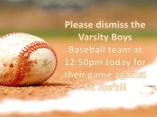 Varsity girls softball and boys baseball teams had successful tournaments and games. The school will hold a food drive challenge and spirit day to support local families in need and cheer on the varsity girls soccer team. Various clubs and groups have meetings and practices this week. The cafeteria is serving pasta, meatballs, mac and cheese, and salads for $5-6. Students are reminded to park properly and report any vandalism.
