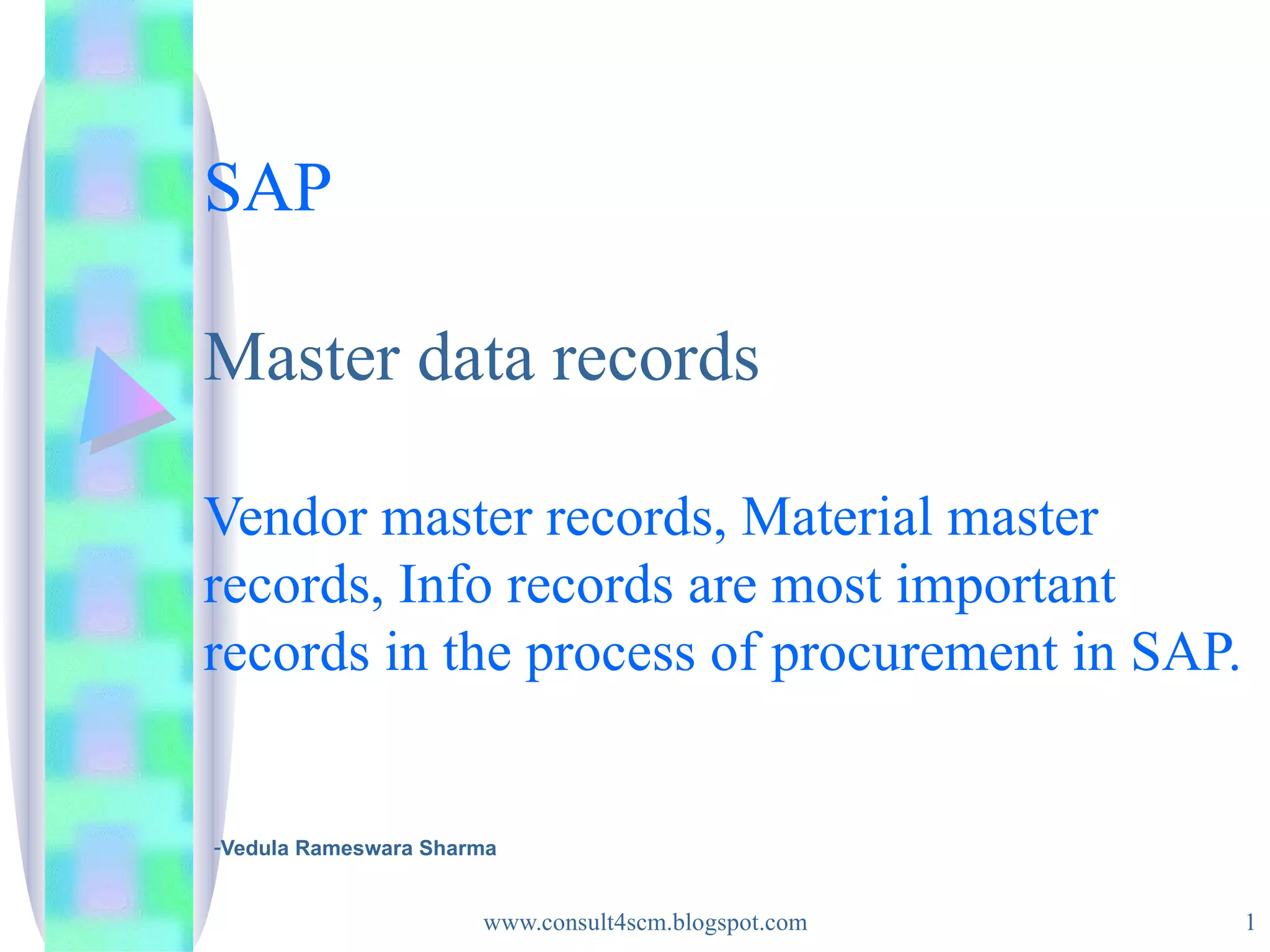 SAP master data records like vendor master records and material master records are important for procurement processes. Vendor master records contain vendor details like addresses, payment terms, and contacts. Material master records are the main source of a company's material data used in areas like purchasing, inventory, and invoices. Both vendor and material master records can be created and changed at different organizational levels in SAP using transaction codes.