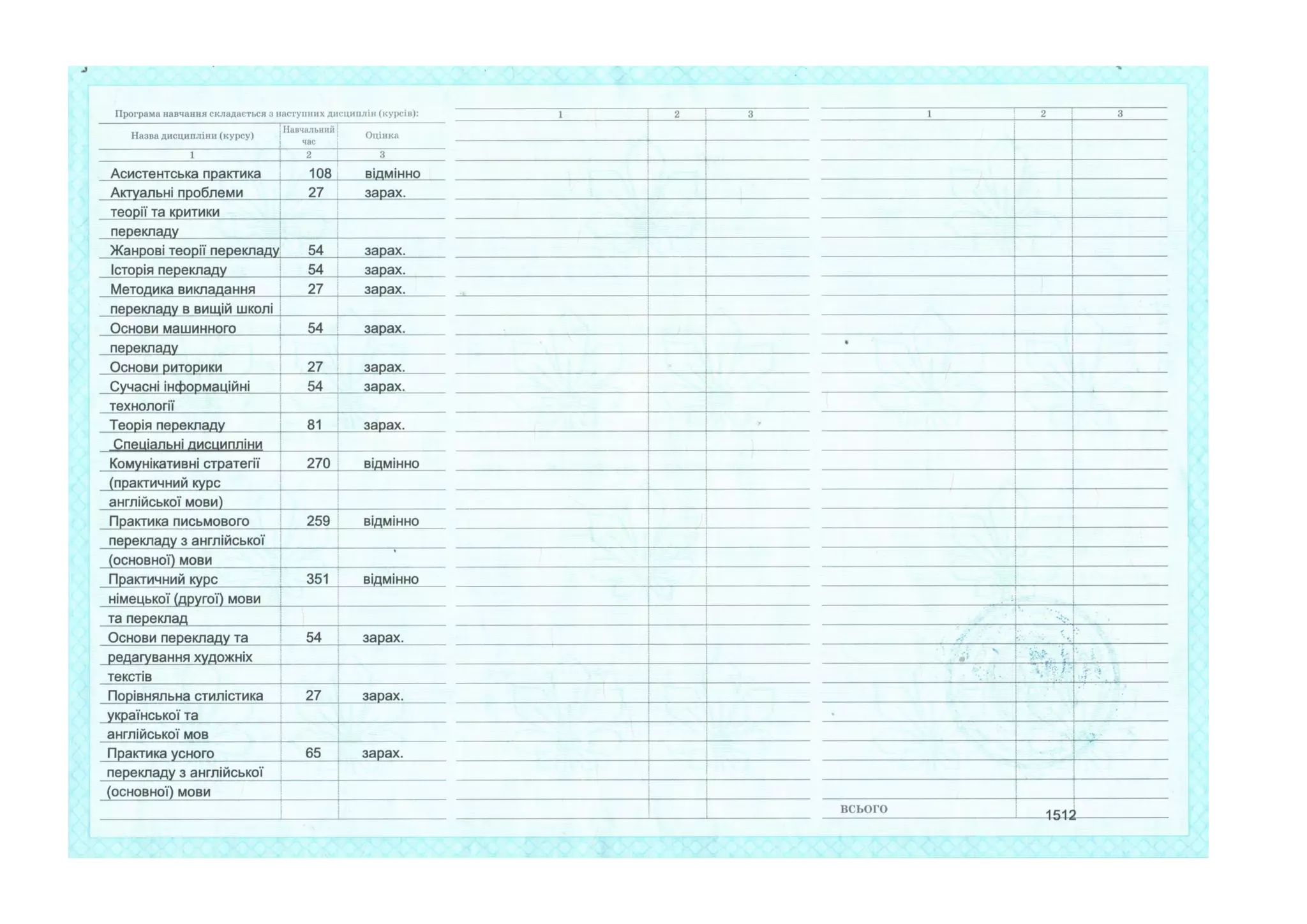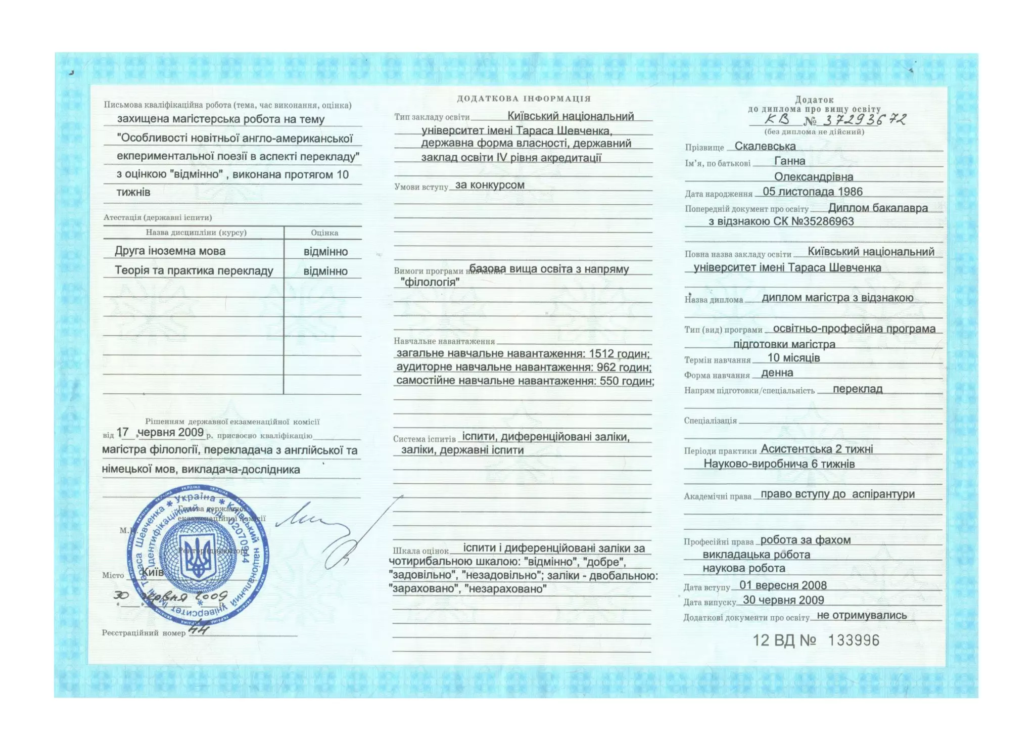 This document is a diploma supplement for Hanna Skalevska, who graduated from Taras Shevchenko National University of Kyiv in 2009 with a Master's degree in Translation Studies with honors. She successfully defended her master's thesis on translating modern Anglo-American experimental poetry and received an excellent mark. She also received excellent marks in her second foreign language and theory and practice of translation. The supplement provides additional information about her program requirements, assessment system, and courses completed.
