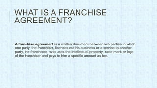 1) A master franchise agreement grants franchise rights for an entire country or territory, allowing the master franchisee to open their own franchise outlets and grant sub-franchises to others.