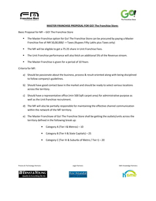 The document outlines a master franchise proposal for "Go! The Franchise Store". It details that the master franchise fee is INR 50,00,000 plus taxes for a 10 year agreement. The master franchisee would receive 75% of unit franchise fees and 5% of revenue. They must recruit 55 unit franchises across various city tiers. Unit franchises require 100 sq ft of space and pay fees ranging from INR 1,00,000 to 3,00,000 depending on city tier. The master franchisee assists with operations and receives 50% of unit franchise renewal fees.