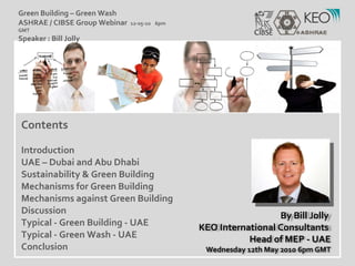 This presentation discusses sustainability and green building in the United Arab Emirates. It focuses on the drivers for sustainability in the UAE, including mechanisms that support and hinder green building efforts. Typical examples of green building and "green wash" projects in the UAE are presented, along with a conclusion that sustainability is popular but green washing and slow regulations present challenges to truly green construction in the region.