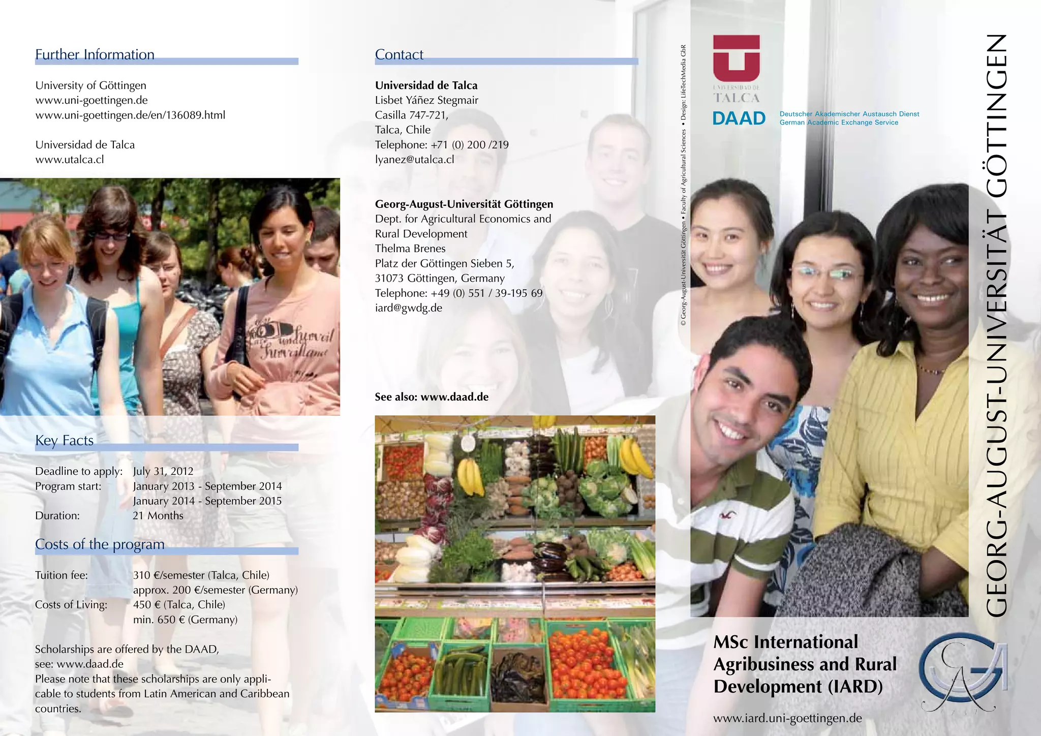 This document provides information about the Master's program "International Agribusiness and Rural Development (IARD)" jointly offered by the University of Göttingen in Germany and the University of Talca in Chile. The 21-month program involves studying for the first two semesters in Chile, then some students may continue their studies in Germany depending on their performance and language skills. The program aims to apply economic theory to agribusiness and rural development problems. Requirements include a bachelor's degree in agriculture or related field, English proficiency, and at least two years of professional experience for DAAD scholarships.