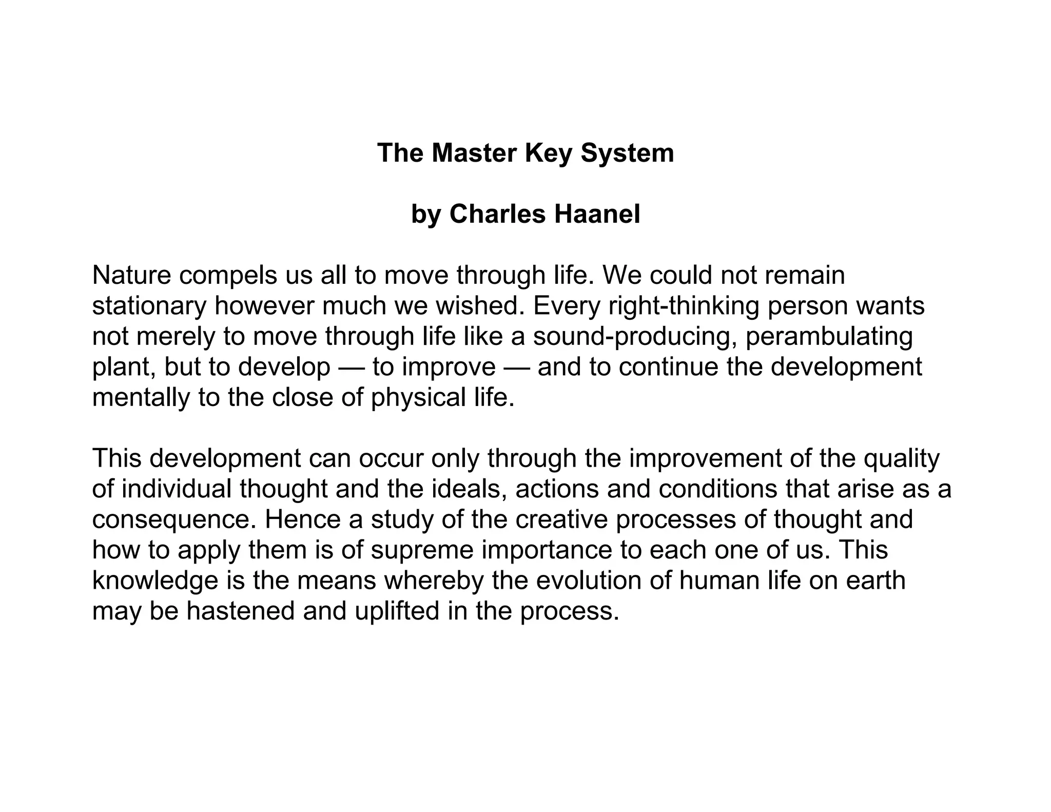 The document introduces "The Master Key System" by Charles Haanel as a means to tap into the great cosmic intelligence and attract that which corresponds to one's ambitions and aspirations. It teaches how to use the power of mind constructively and creatively by first creating one's desires in thought. The Master Key explains how understanding and applying the creative processes of thought can hasten the evolution of humanity and uplift life on Earth. It promises to develop greater personality, character, and the power to achieve any worthy purpose by cultivating imagination, desire, intuition and other mental faculties.