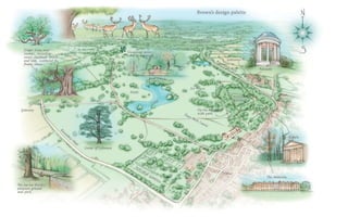 2. Humphry Repton was a landscape gardener in the 18th century who succeeded Capability Brown. He saw gardening as an art form and emphasized enhancing natural beauty. He published books detailing his design process and principles of disguising artifice.