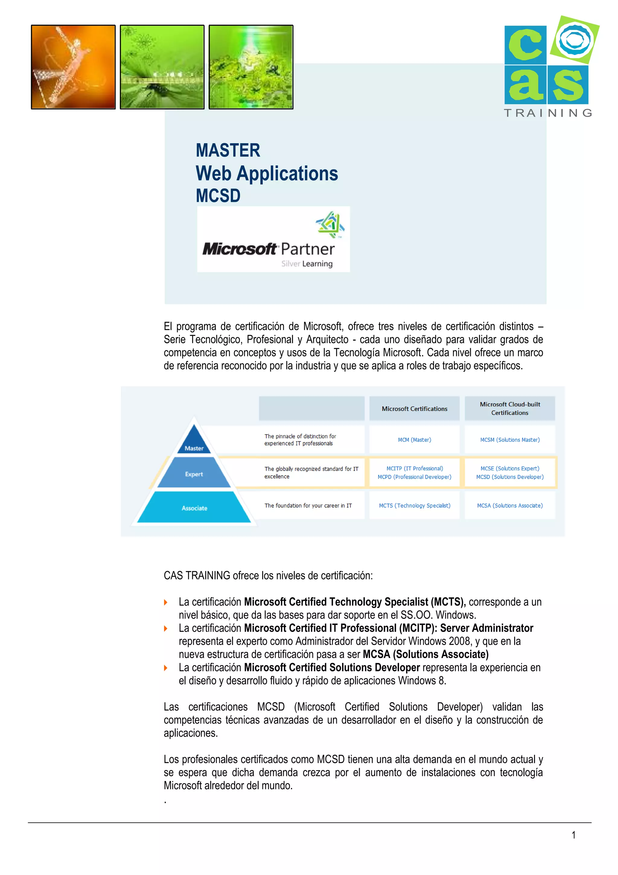 The document provides information about a training course to obtain the MCSD: Web Applications certification. It details the objectives, schedule, location, methodology, and curriculum of the 2-month, 100-hour course. The course aims to validate advanced technical skills in designing and building web applications, and will cover HTML5, JavaScript, CSS3, ASP.NET MVC, and other topics through 14 modules. It is directed at individuals with strong programming fundamentals, especially in C#, and will take place evenings from 7-10pm in Madrid.