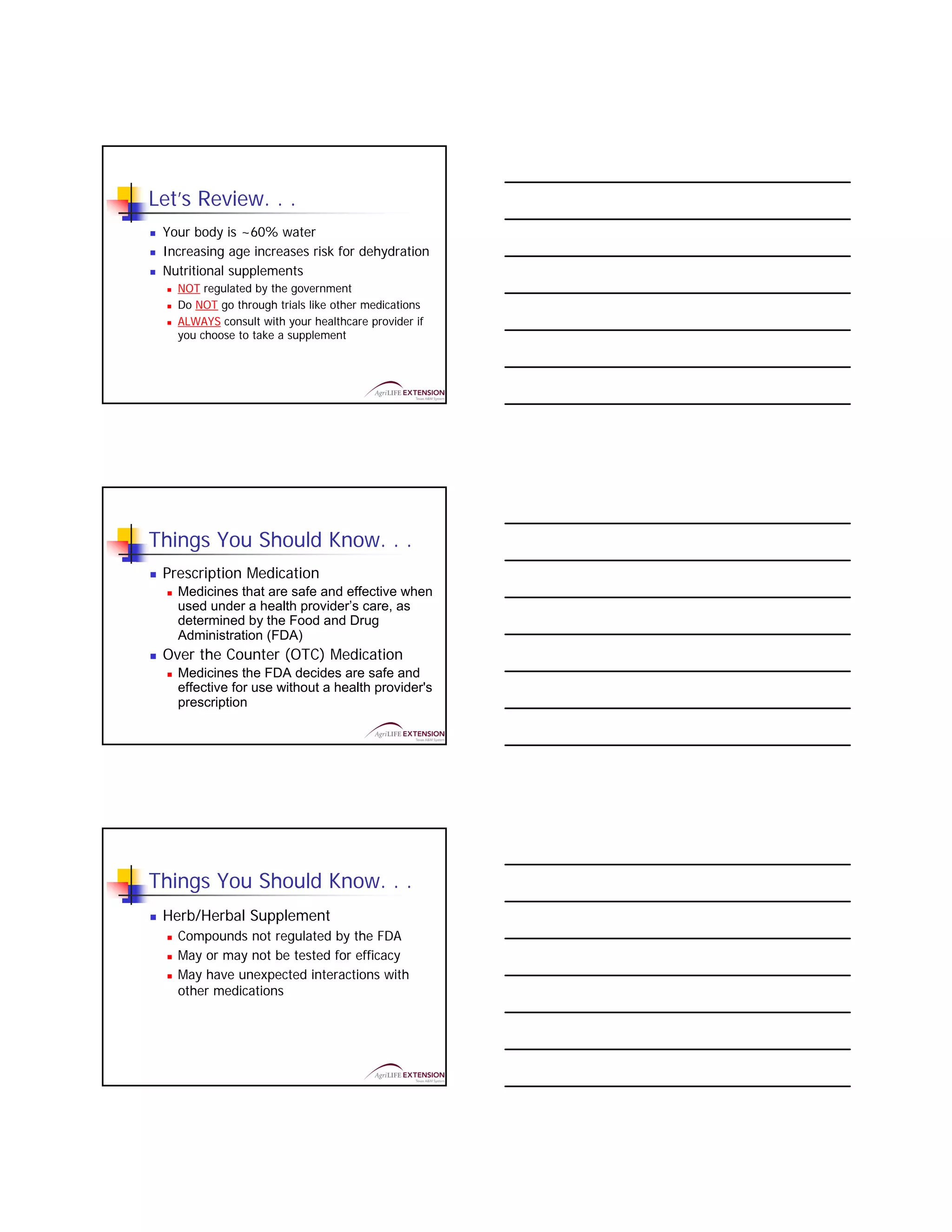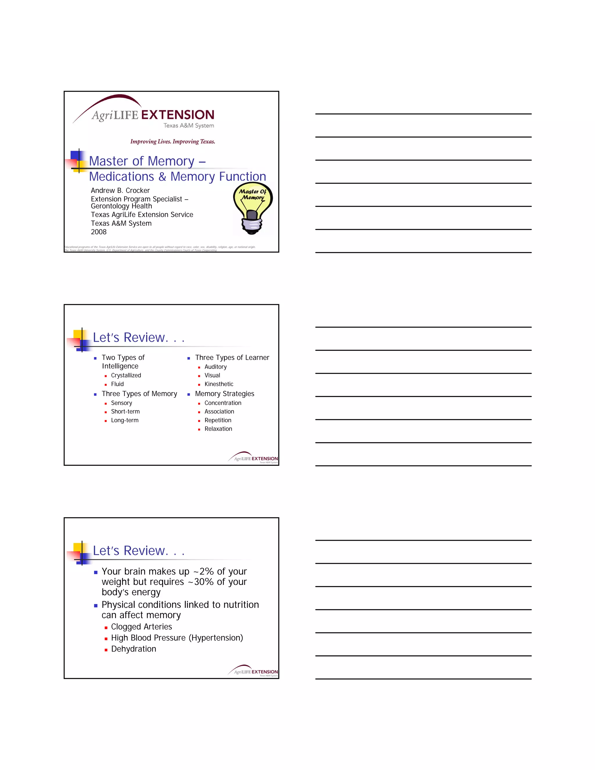 This document discusses how medications can affect memory function. It begins by reviewing the types of intelligence, memory, and learning strategies. It then discusses how physical health factors like nutrition, hydration, and medications can impact memory. It provides information on different types of medications and supplements, and notes that many have not been tested on older adults. It emphasizes the importance of consulting healthcare providers about any medications or supplements. The document aims to educate older adults on medication risks and strategies to reduce those risks, like keeping medication lists and being aware of side effects.