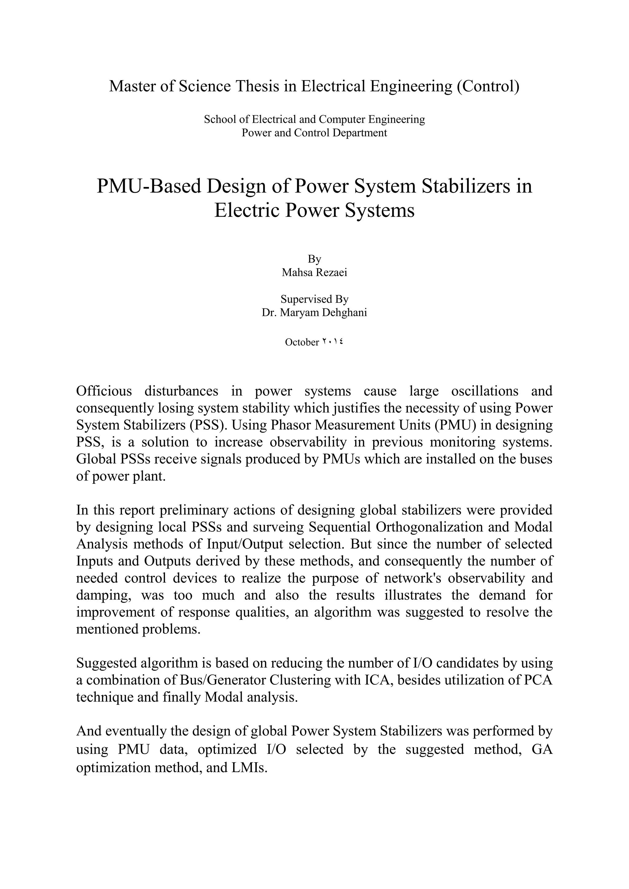 This thesis proposes a method for designing global Power System Stabilizers (PSS) using Phasor Measurement Unit (PMU) data. The method first designs local PSS using existing input/output selection techniques, but finds that the number of selected inputs and outputs is too large. The thesis then suggests a new algorithm that uses bus/generator clustering with independent component analysis and principal component analysis to reduce the number of input/output candidates. Finally, the design of global PSS is performed using the optimized input/output selection from the new method, PMU data, a genetic algorithm optimization method, and linear matrix inequalities.