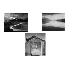 This document discusses Samantha Pakula's master photography project that was influenced by Ansel Adams. It summarizes that Adams became fully dedicated to photography in the 1930s and preferred black and white images. Pakula's project consists of 10 landscape photographs taken in black and white, inspired by Adams' work highlighting the natural beauty of scenery.