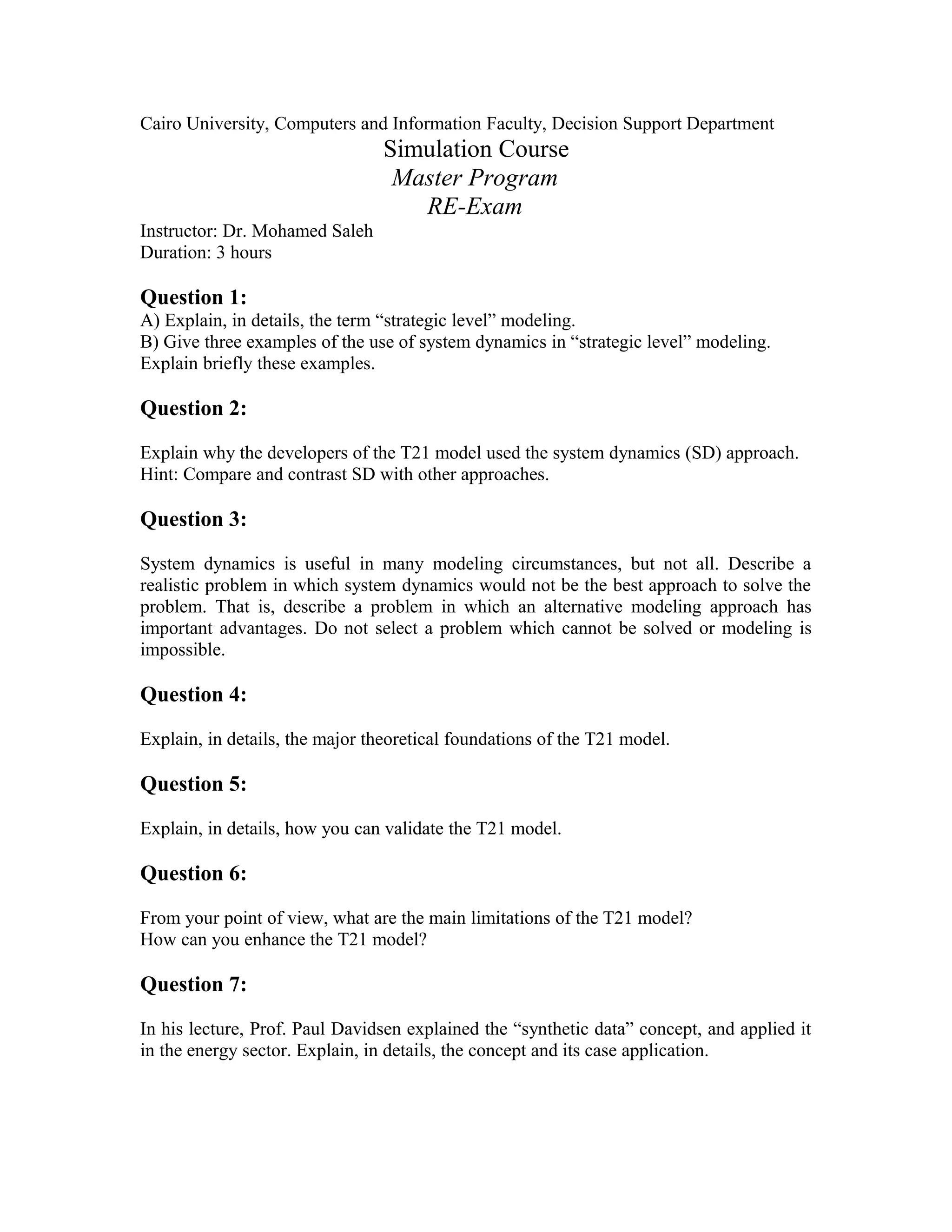 The document is a simulation course exam for a master's program consisting of 7 questions about system dynamics modeling. The exam is 3 hours long and administered by Dr. Mohamed Saleh. The questions cover strategic level modeling, comparing system dynamics to other approaches for the T21 model, an alternative modeling approach, theoretical foundations and validation of the T21 model, limitations and enhancements of the T21 model, and the concept of synthetic data and its application in the energy sector.
