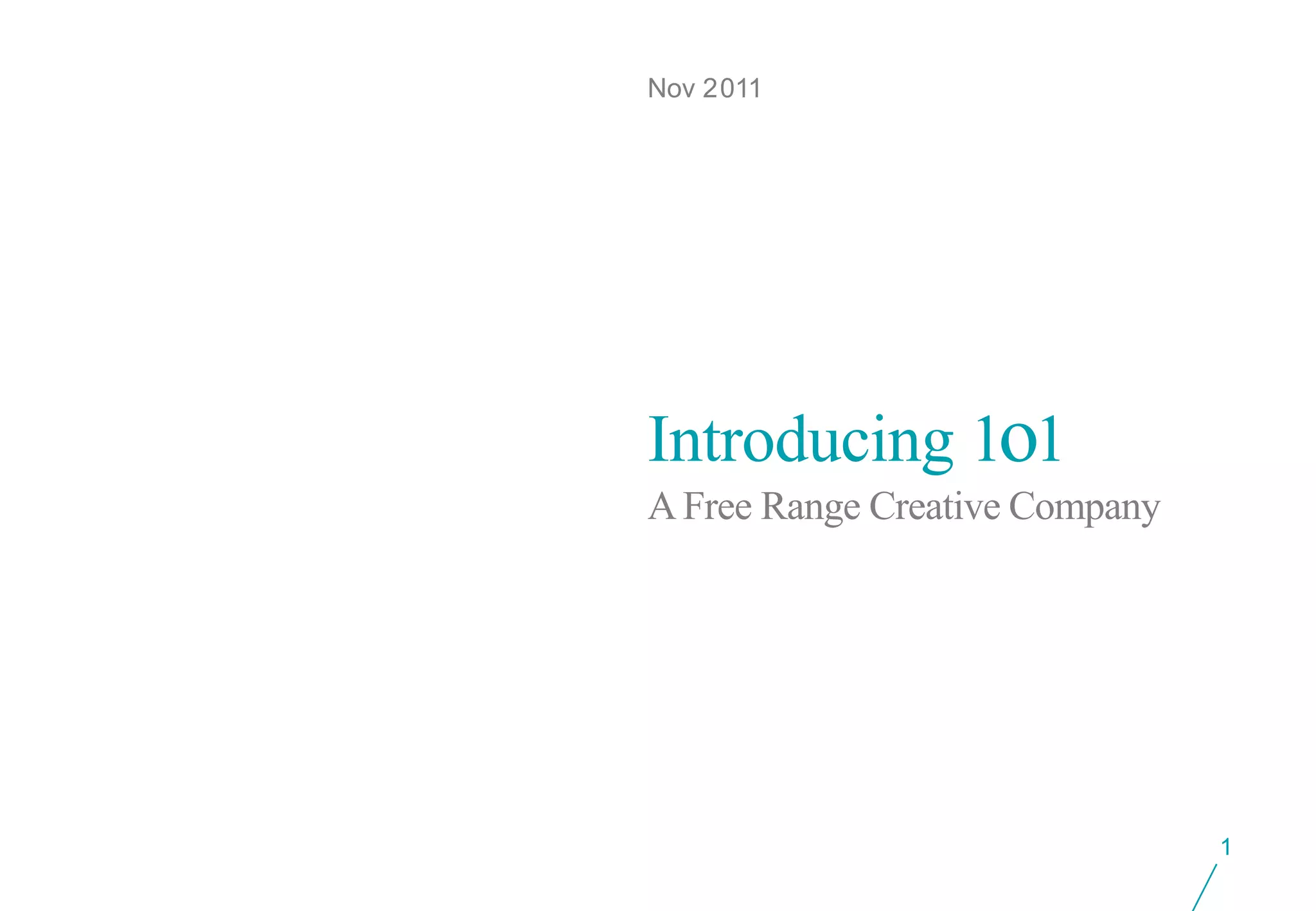 1o1 is a creative company founded by people who have seen the impact of great brands and ideas. They call themselves a "free range creative company" that is free to solve business problems or seize opportunities beyond traditional advertising agencies. Their ambition is to use creative imagination to address business problems rather than just create communications. They provide branding, advertising, and other creative work for clients.