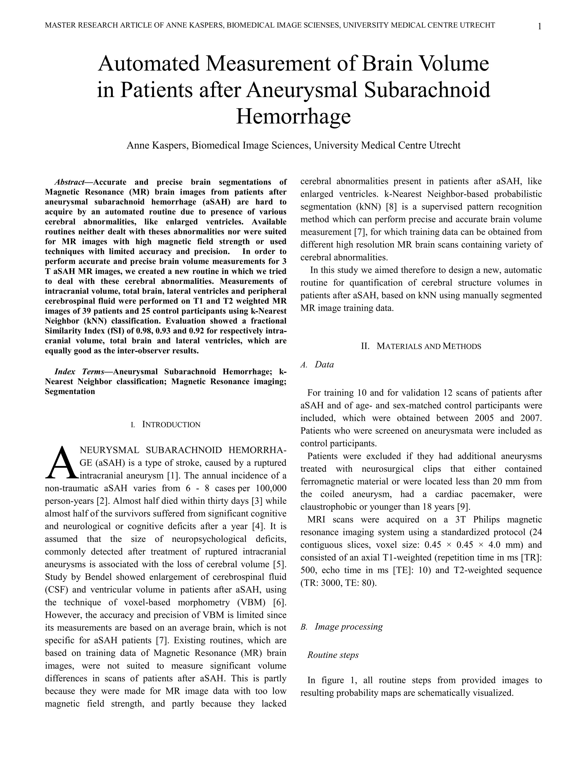 1) The study aimed to develop an automated routine for precise brain volume measurement in patients after aneurysmal subarachnoid hemorrhage (aSAH) using magnetic resonance (MR) images.