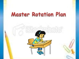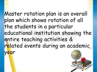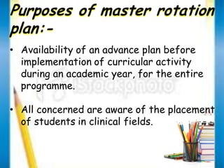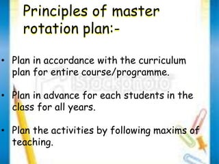 The document discusses various aspects of curriculum planning including master rotation plans, course plans, and unit plans. A master rotation plan shows how students will rotate through various clinical and community placements over time, ensuring all students receive equal experiences. Course plans detail the organization of a particular course, including objectives, content, teaching methods, learning activities, and evaluation. Unit plans describe individual instructional units within a course. Effective planning at each of these levels is important to ensure coherence and coordination across the curriculum.