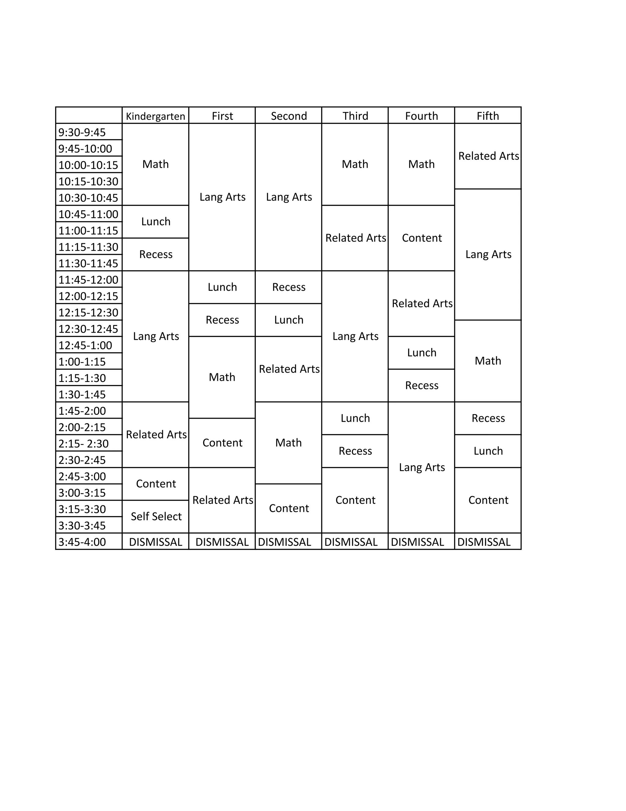 The document shows a daily schedule for kindergarten through fifth grade students with timeslots ranging from 9:30-4:00. The schedule blocks are broken down by subject including math, language arts, content areas, related arts, lunch, recess, and dismissal times. The schedules vary by grade with different subjects and activities assigned to each time block.