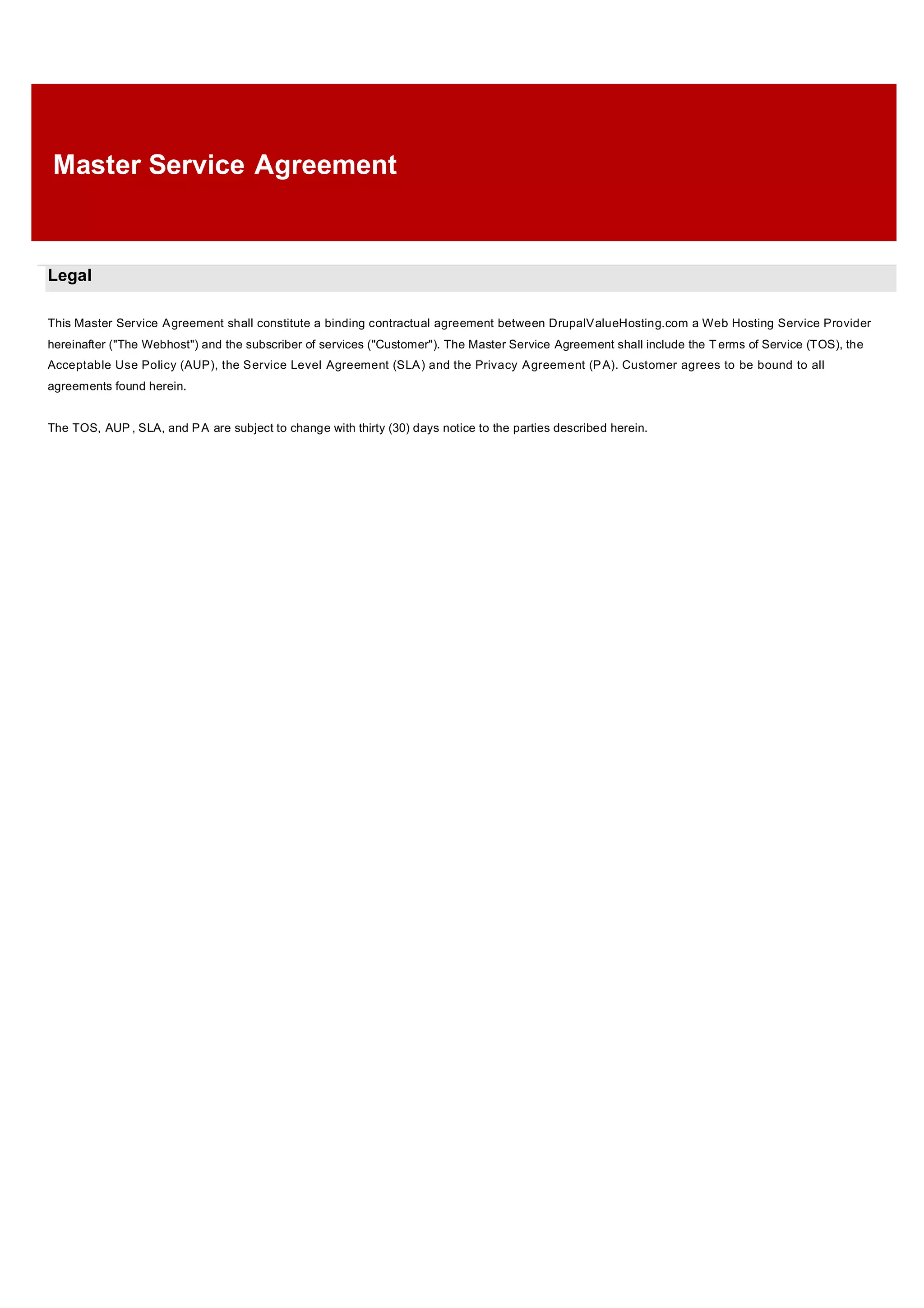The Master Service Agreement outlines the binding terms between drupalvaluehosting.com and its customers, including services provided, fees, cancellation policies, and legal obligations. Key terms include customers' agreement to service fees due in advance, non-refundability of services, and the requirement for written cancellation notice. The document also details the Service Level Agreement (SLA) and Acceptable Use Policy (AUP) governing service reliability and user conduct.
