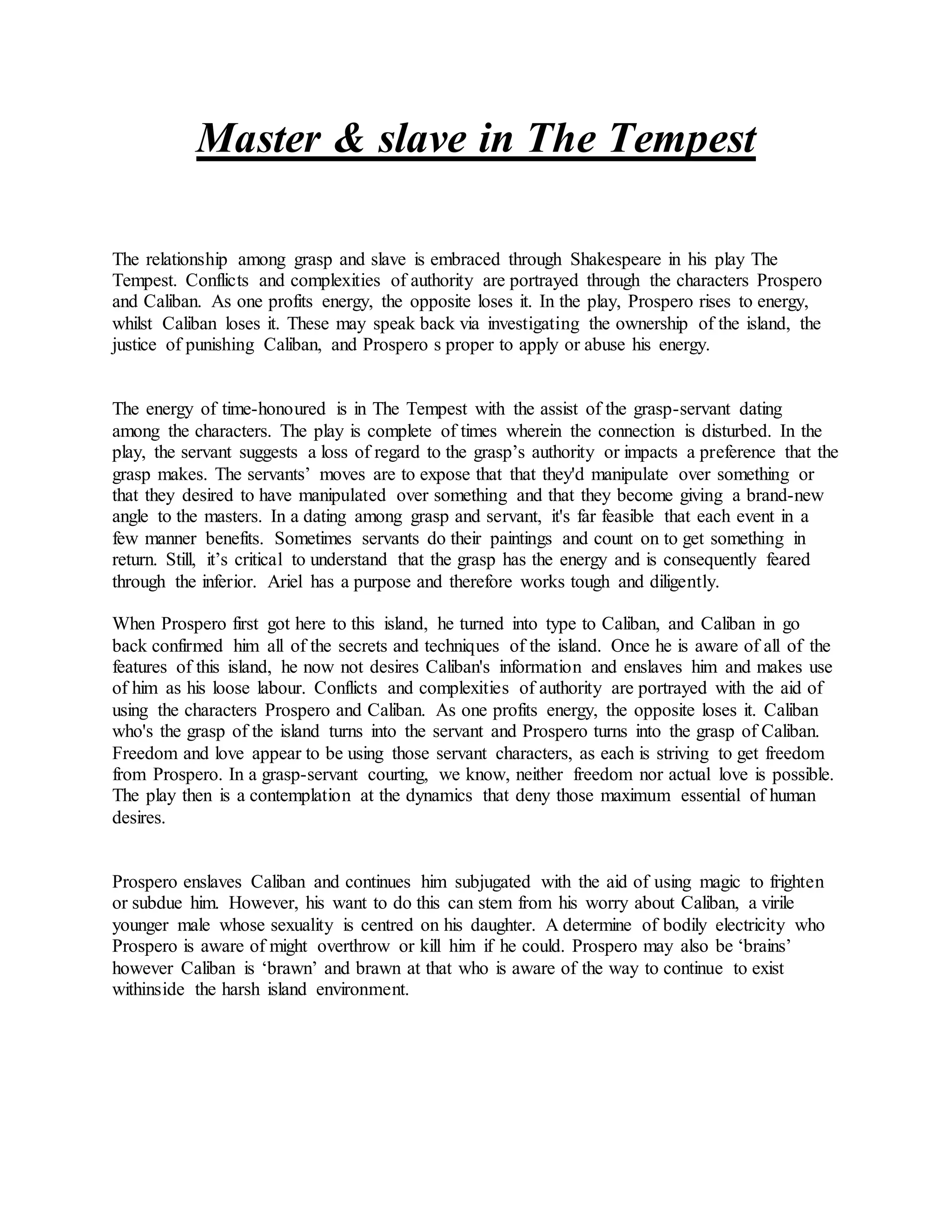 The document discusses the master-slave relationship between Prospero and Caliban in Shakespeare's play The Tempest. Prospero gains power over the island and its original inhabitant Caliban, who loses his power and freedom. Their relationship is complex, as Prospero justifies his enslavement of Caliban by claiming Caliban tried to rape his daughter. Meanwhile, Ariel is also Prospero's slave but is submissive due to the promise of eventual freedom, unlike the rebellious Caliban who has no such promise. Both Ariel and Caliban are subject to Prospero's magical powers and commands, though their attitudes towards their servitude differ.