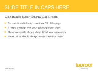- Using title slides with large text in caps and subheadings in smaller gray text.