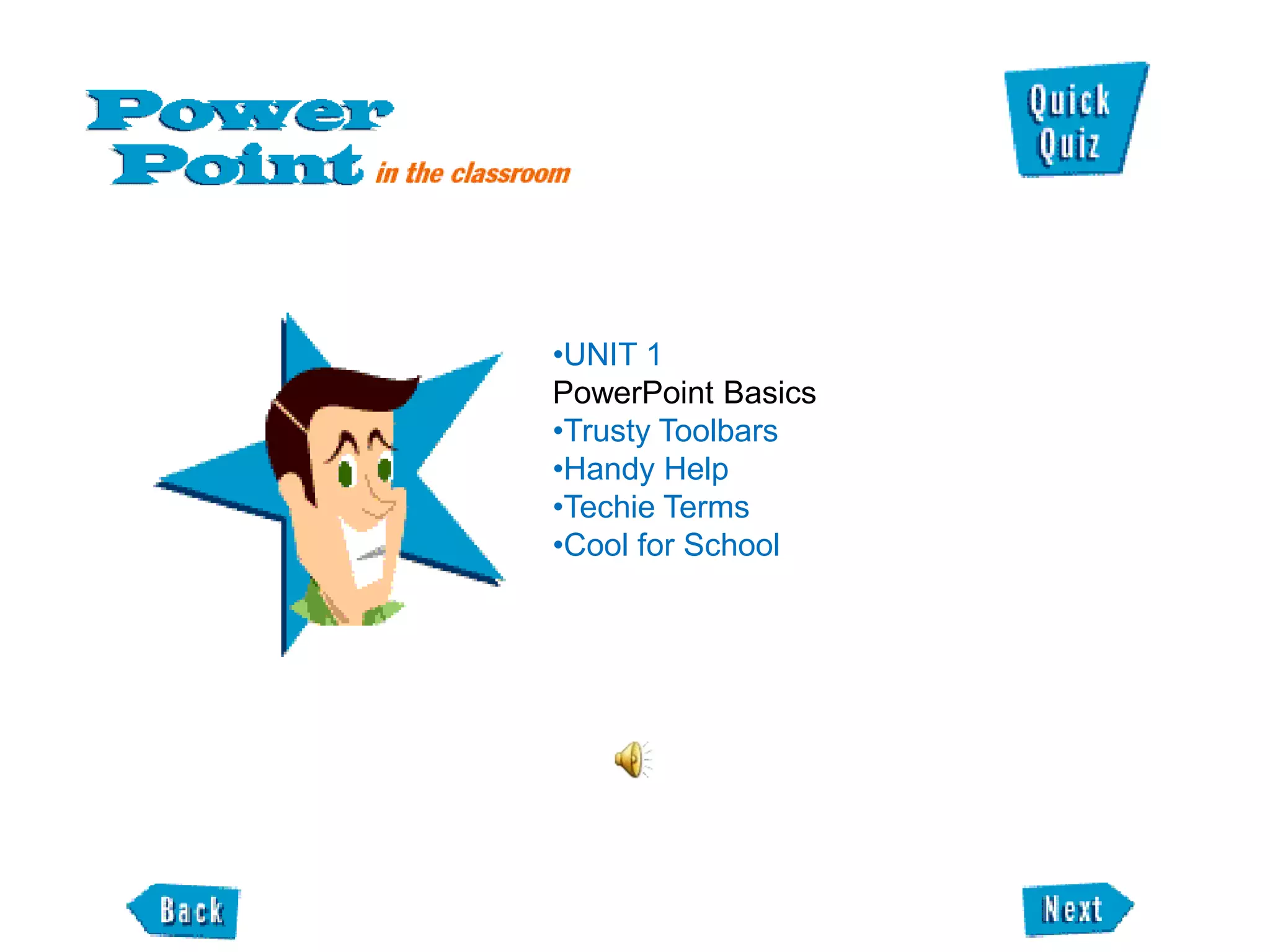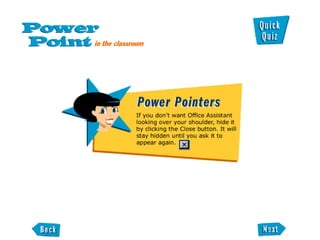 This document provides an overview of the main PowerPoint toolbars and how to use them. It discusses the four main toolbars - the Standard toolbar, Formatting toolbar, Drawing toolbar, and how to move and dock them. It also covers adding and removing other toolbars like the Picture toolbar and Animation Effects toolbar. The document introduces some key PowerPoint terms and concludes with a quick quiz to test the reader's understanding.