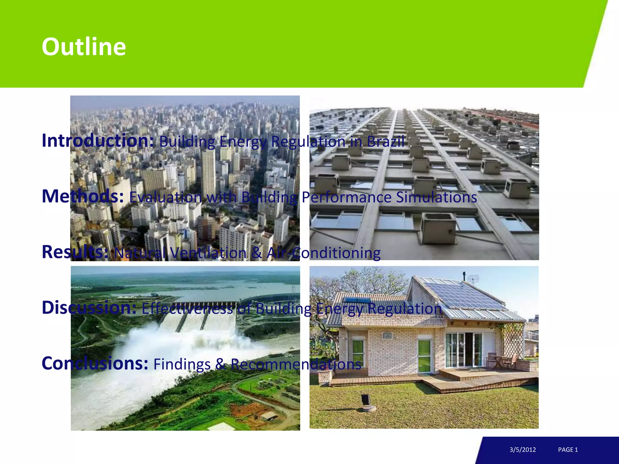 This document summarizes a final colloquium presentation on using building performance simulations to evaluate building energy regulation for residential buildings in Brazil. The presentation discusses Brazil's growing electricity consumption and the introduction of energy labeling for residential buildings. It then uses simulations to evaluate a simplified method used in the energy labeling by comparing performance indicators for natural ventilation and air conditioning against a more detailed energy modeling approach. The results show limitations in the simplified method, and recommendations are made to improve it to better assess building energy efficiency.