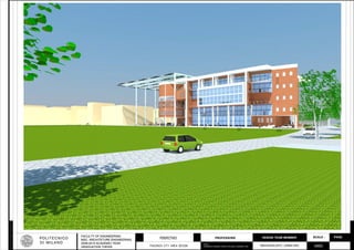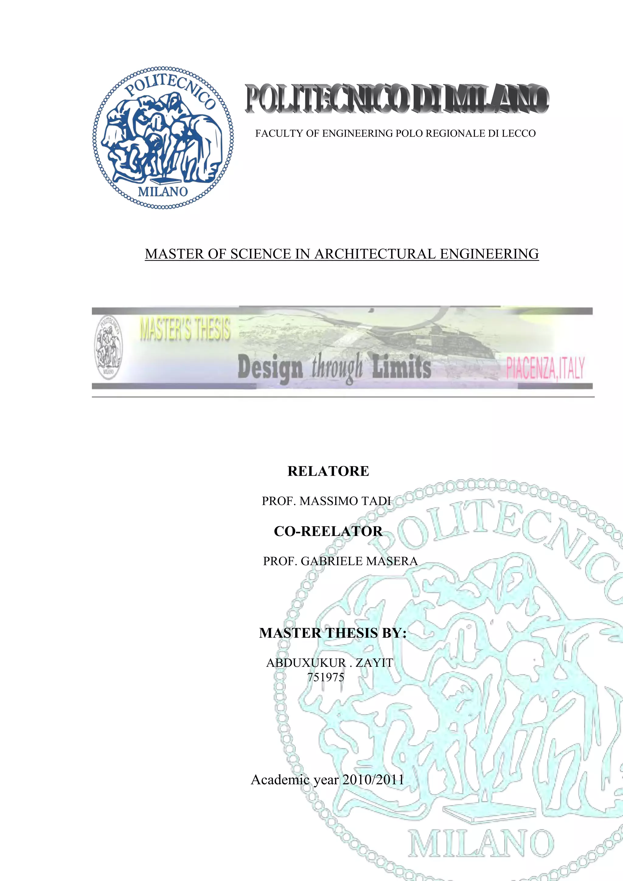 This document is a master's thesis submitted by Abduxukur Zayit to the Faculty of Engineering at the Polo Regionale di Lecco in Italy. The thesis examines the urban context of Piacenza, Italy and proposes a design for a new public library building in the city. It includes sections on the urban context and history of Piacenza, an urban design proposal for the site of the new library, architectural designs for the proposed library building, structural designs, considerations of building physics and climate for the site, and technological designs focused on making the building energy positive. The goal of the project was to interconnect the landscape, urban spaces, and architectural design of the library with a focus on positive energy use.