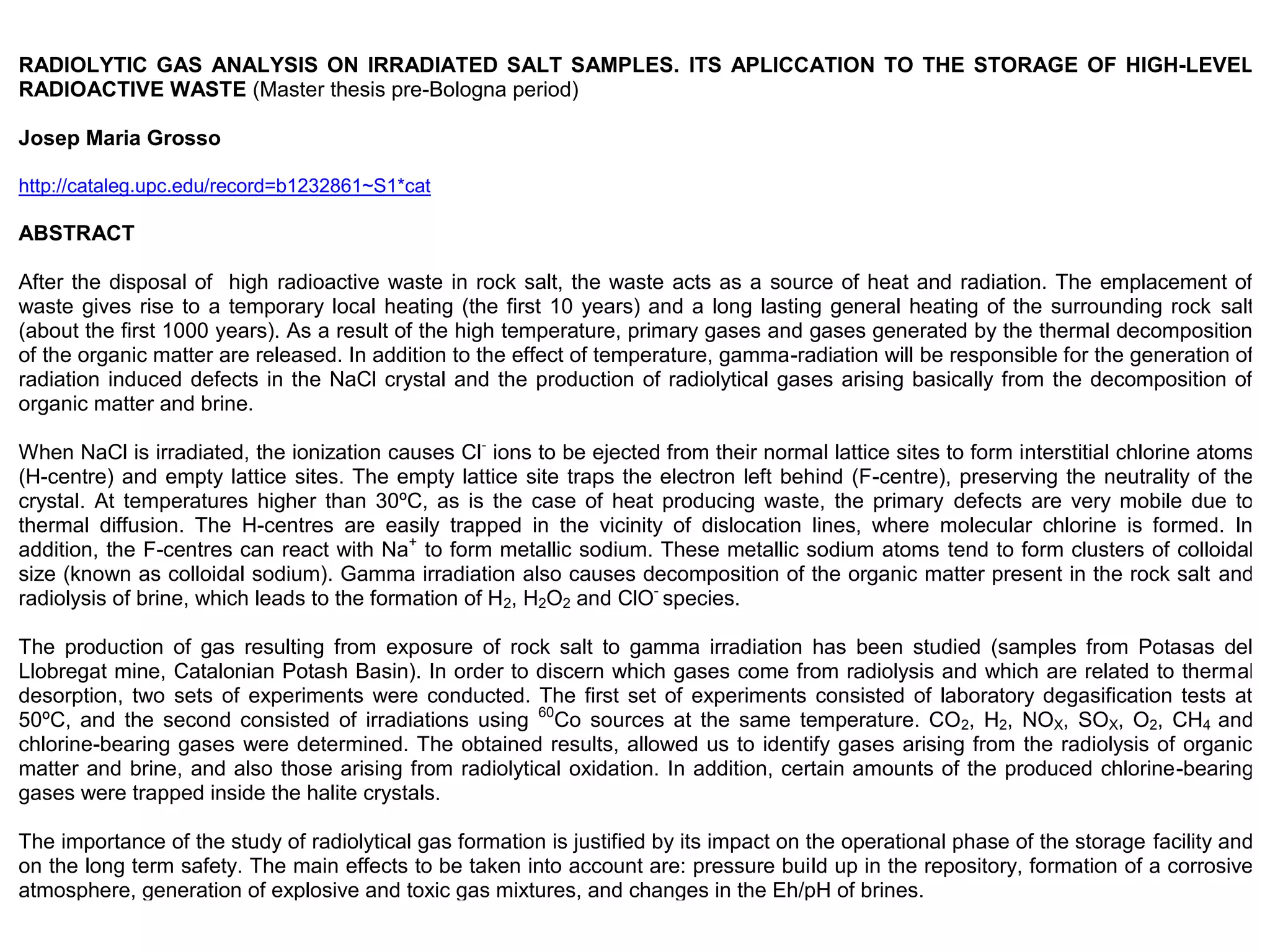 Llobregat mine, Catalonian Potash Basin). In order to discern which gases come from radiolysis and which are related to thermal