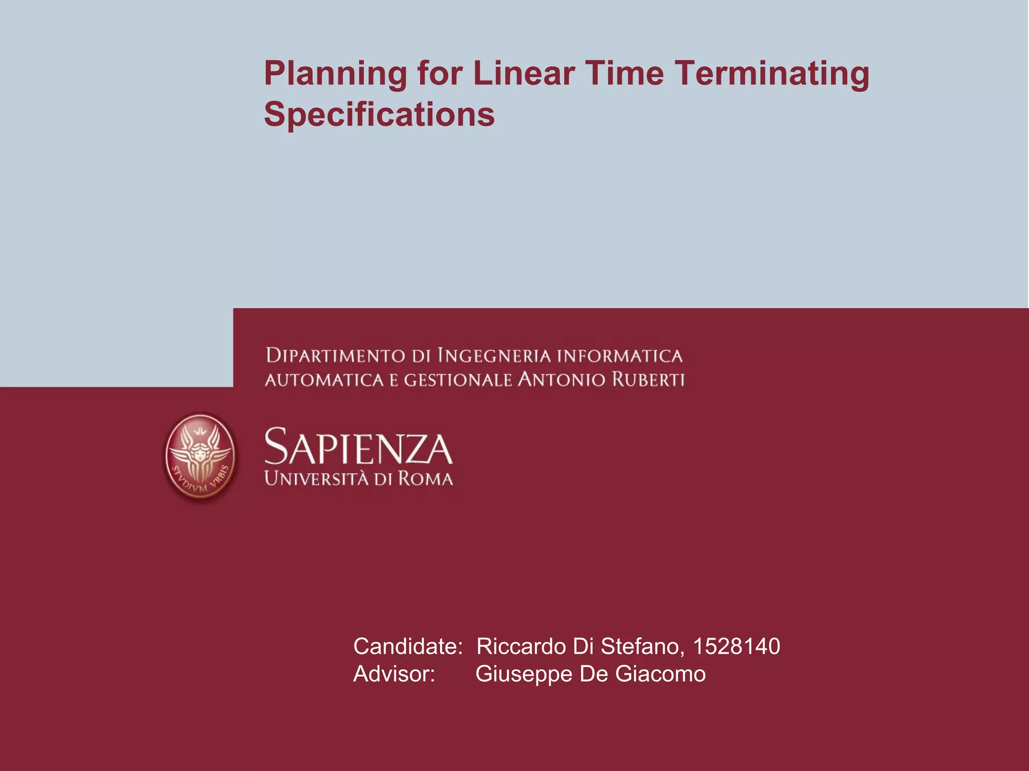 The document outlines a thesis focused on synthesizing action sequences in planning, particularly incorporating trajectory constraints via linear temporal logic over finite traces (ltlf). It discusses the design and implementation of automata for ltlf goals and describes two approaches to planning: a traditional method and a novel simulation-based planner. The results include working implementations of various automata and planning approaches, with future work suggesting further advancements in the automata methodology.