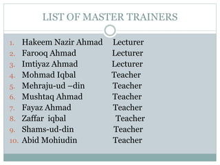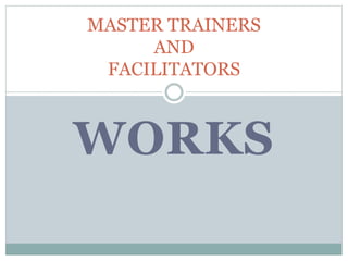 This document outlines the plans for election training to be conducted over three phases. It provides lists of master trainers and facilitators who will lead the sessions. The training will take place in 4 classrooms, with around 50 participants per class. In the first phase, the training will be introductory in nature without voting machines. The second phase will provide more detailed training and demonstrations with voting machines. The final phase will train the actual polling staff before Election Day. Facilitators are responsible for participant attendance and logistics in their local areas.