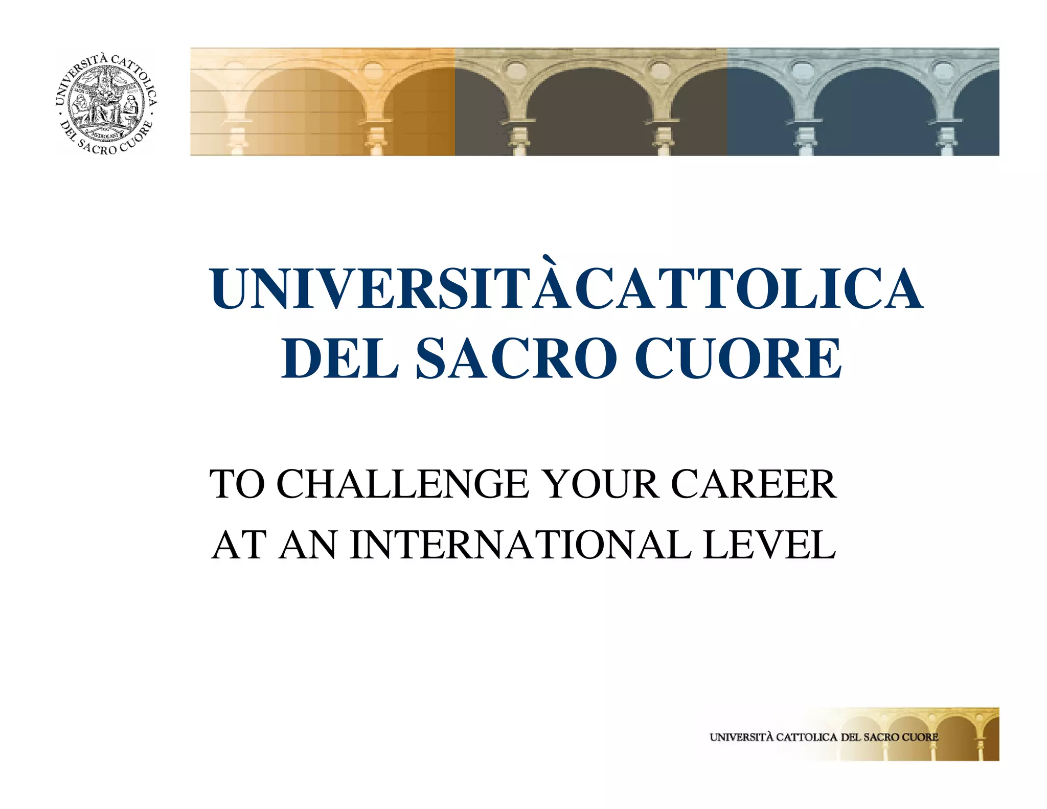 The document provides information about Università Cattolica del Sacro Cuore, the largest private university in Europe. It has 42,000 students, 1,400 academic staff, and 5 campuses across Italy. The university offers 44 bachelor's degrees, 38 master's degrees, and over 100 master's courses. It has strong international partnerships and offers programs taught in English. The document highlights the university's research collaborations, connections to industry, placement rates, and scholarship opportunities.