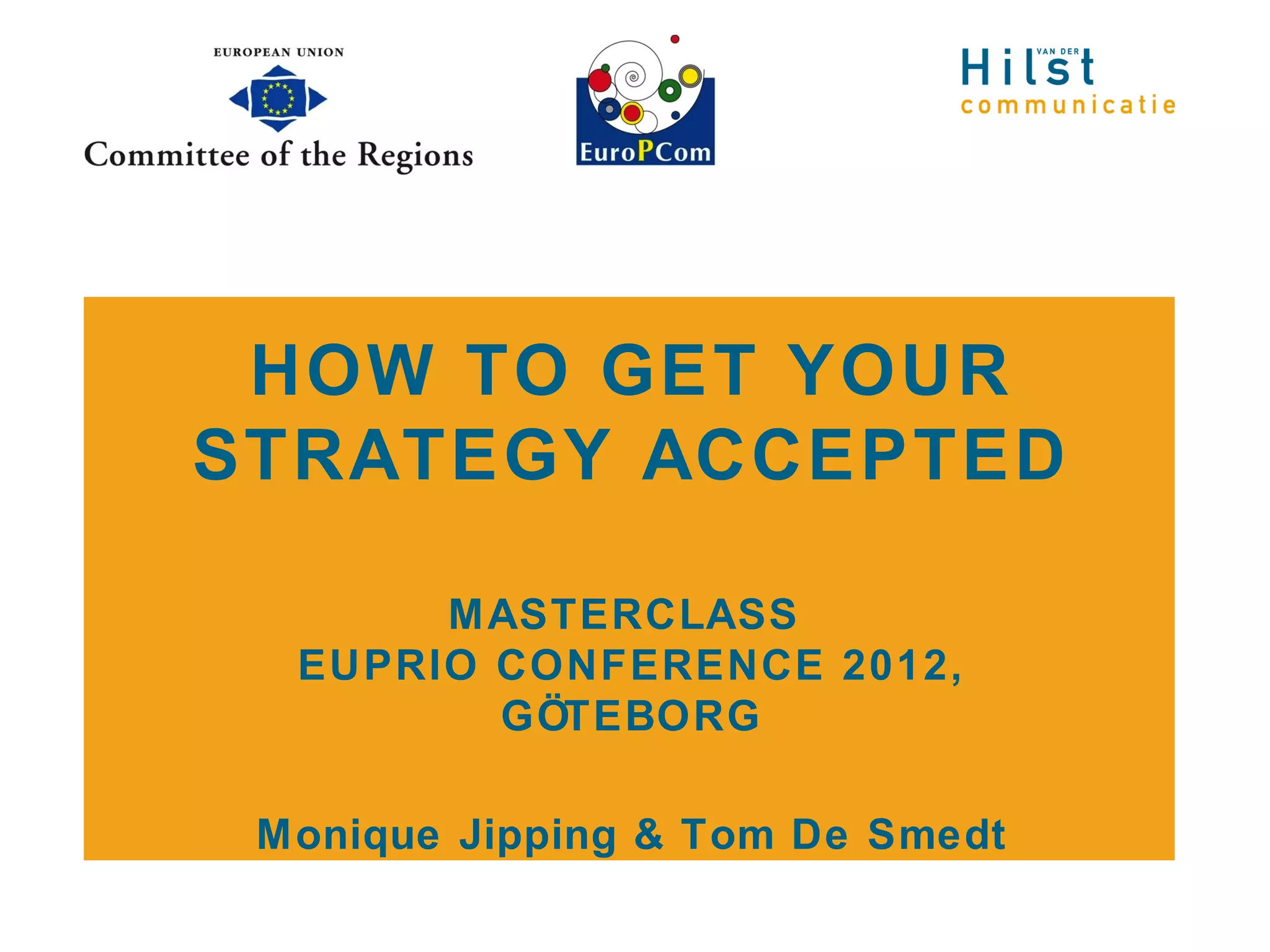 This document provides guidance on developing and gaining acceptance for communications strategies within organizations. It discusses barriers to professional communications management, key dimensions of communications strategy and management, and a workflow for developing a communications strategy plan. It emphasizes listening, collaboration, and preparing both the strategy and management team for validation and implementation. When "selling" the strategy, it recommends choosing an effective presentation approach and avoiding tactics like multiple choice questions or compromises that could undermine defending or implementing the strategy.