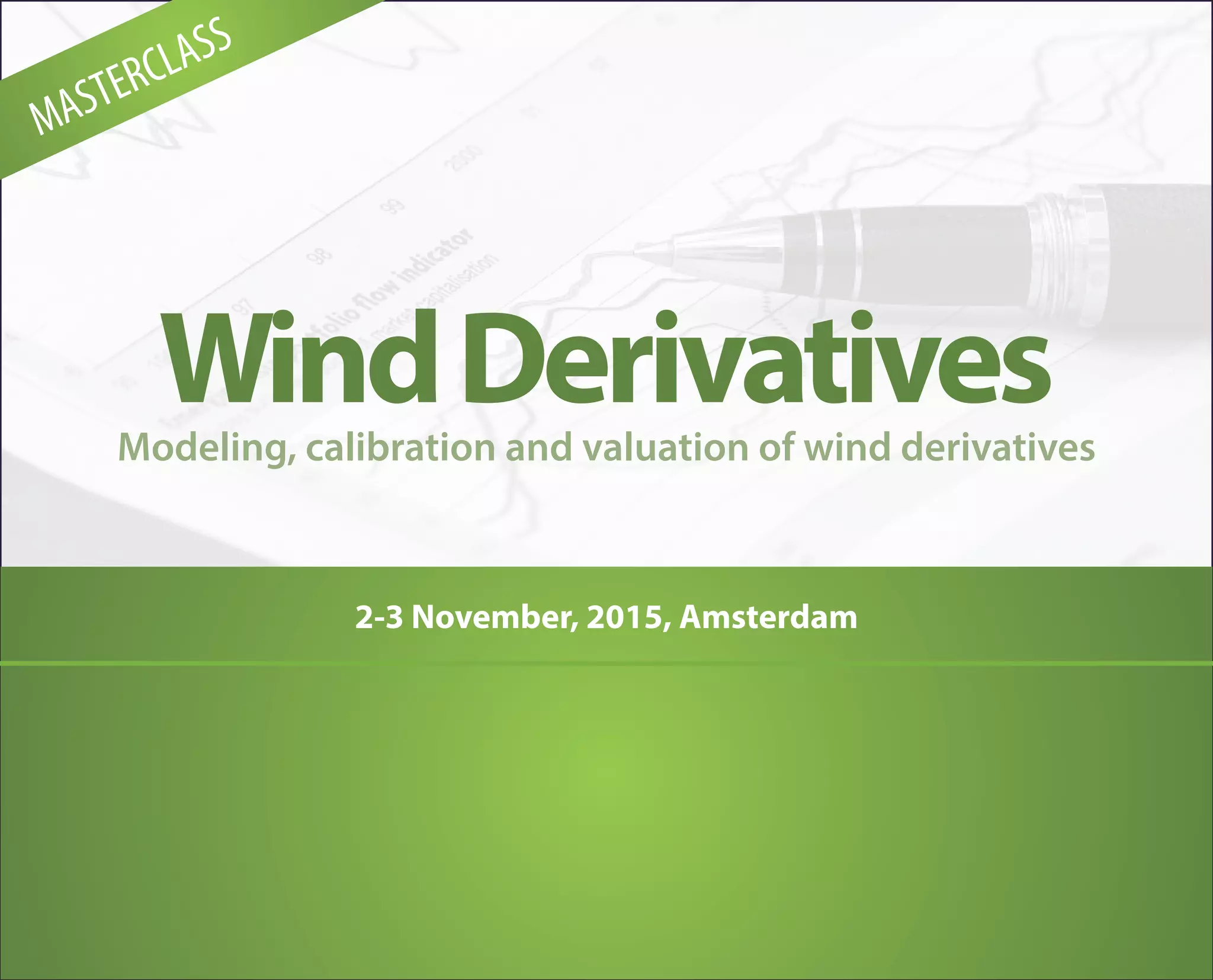 The two-day masterclass in Amsterdam, scheduled for November 2-3, 2015, aims to enhance participants' understanding of weather risk analysis, wind turbines, and the modeling, calibration, and valuation of wind derivatives. Attendees will engage in interactive training sessions covering weather and wind risk, modeling techniques, and pricing methods for wind derivatives, supplemented by practical exercises. The workshop is designed for professionals in wind risk management or those trading weather derivatives, and is delivered by expert Steven Hoyer from McKinsey & Company.