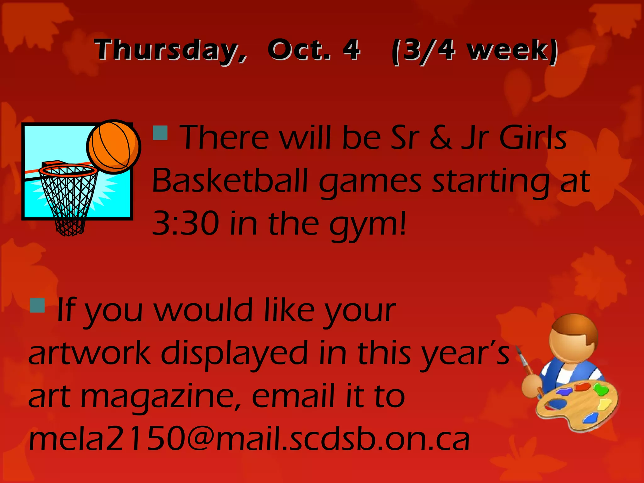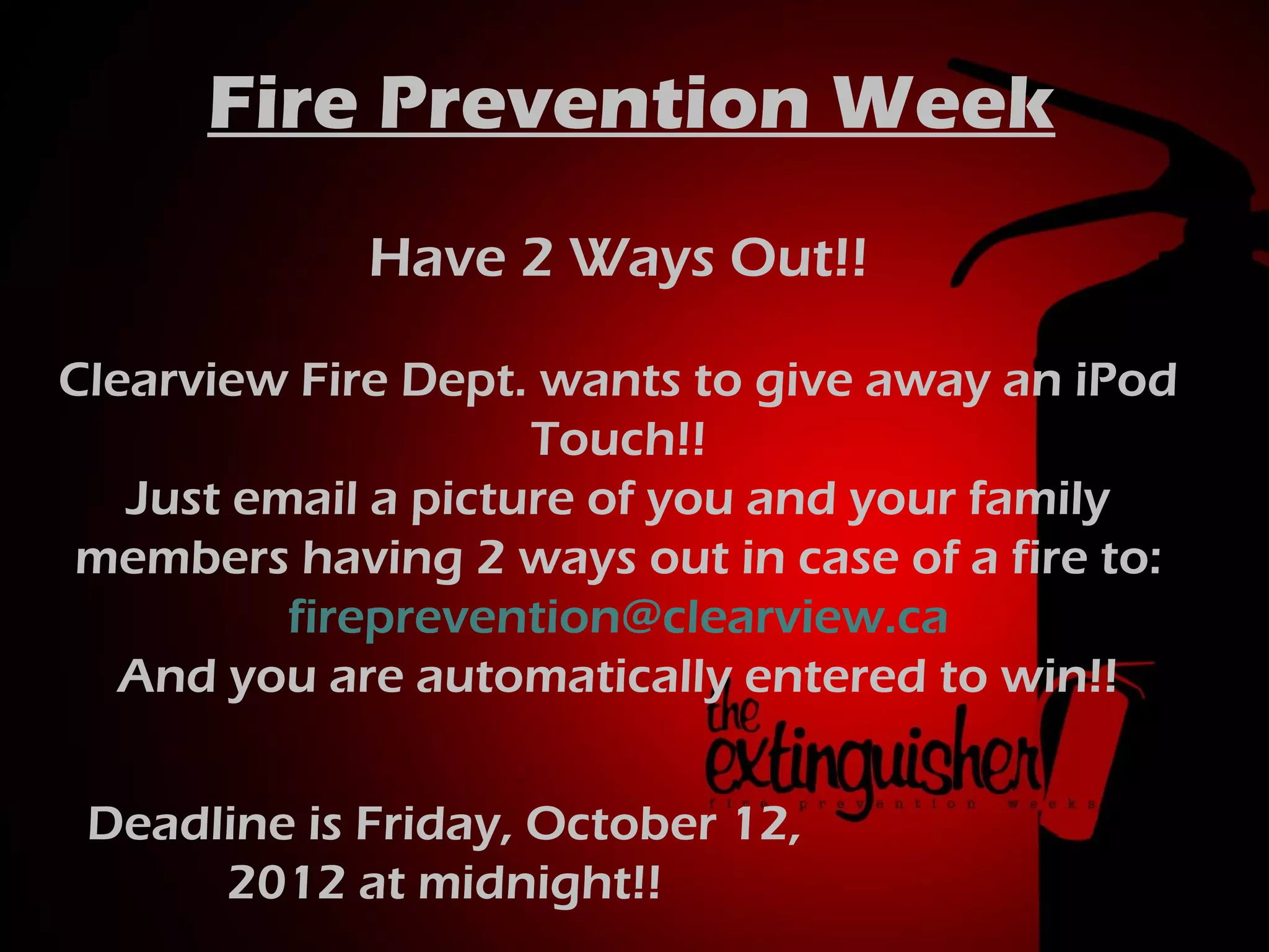 The document contains announcements for students at a school including upcoming sports games and art submissions, volunteer opportunities, university information sessions, and cafeteria specials. Fire prevention week activities are also advertised including a chance to win an iPod for sharing a photo of home fire safety.