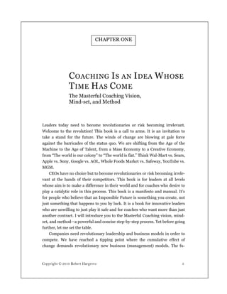 This document introduces the concept of coaching as an idea whose time has come. It discusses how leadership is shifting from command and control models to ones where the leader acts as a coach. Coaching helps leaders and their organizations reach impossible futures and adapt to ongoing changes. The passage outlines the vision, mindset and method of Masterful Coaching and how coaching can help CEOs and companies facing complex challenges in today's business environment.