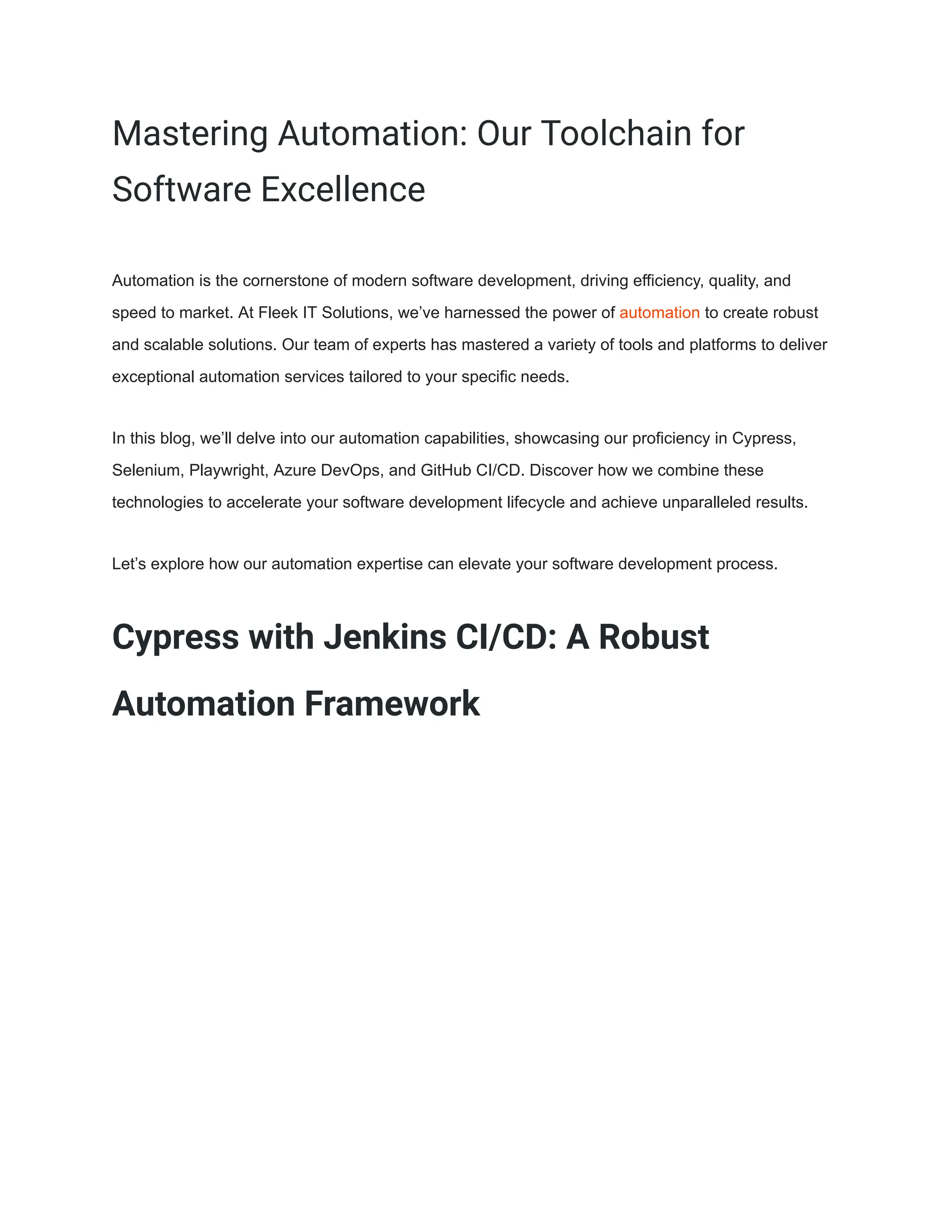 Fleek IT Solutions emphasizes the critical role of automation in software development, showcasing a variety of tools and platforms such as Cypress, Jenkins, Selenium, GitLab CI/CD, and Azure DevOps to enhance efficiency, quality, and speed to market. The document details their comprehensive automation frameworks for testing UI and APIs across different applications, along with integration processes that facilitate efficient test execution and reporting. By leveraging these technologies, Fleek IT Solutions aims to accelerate the software development lifecycle and improve product quality.